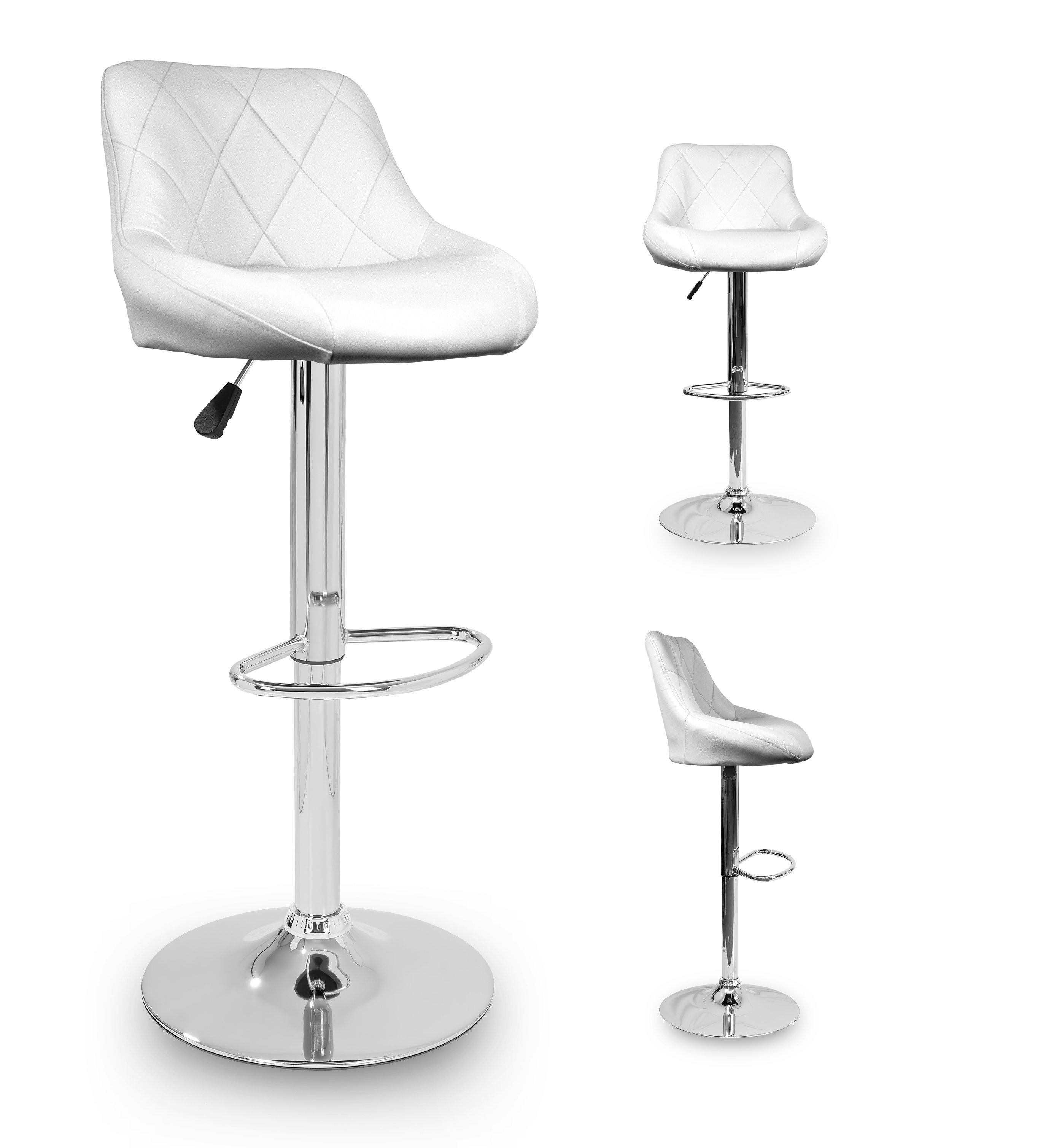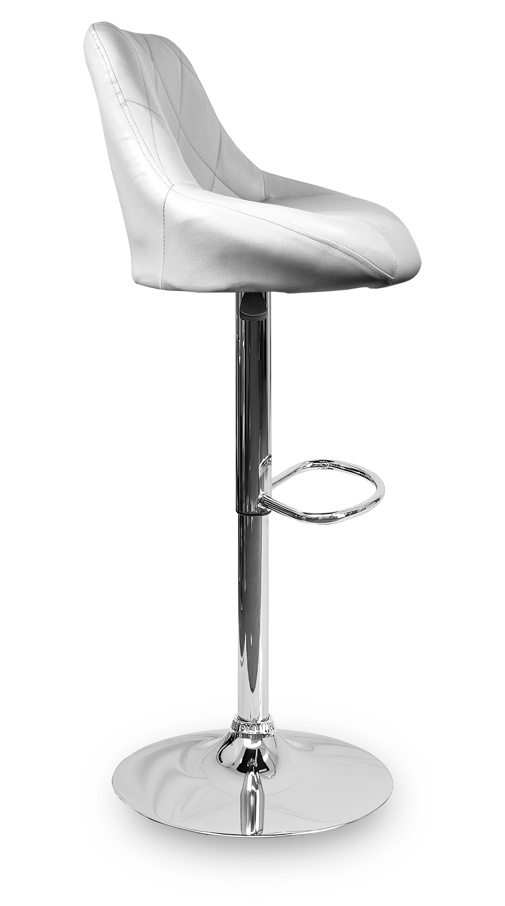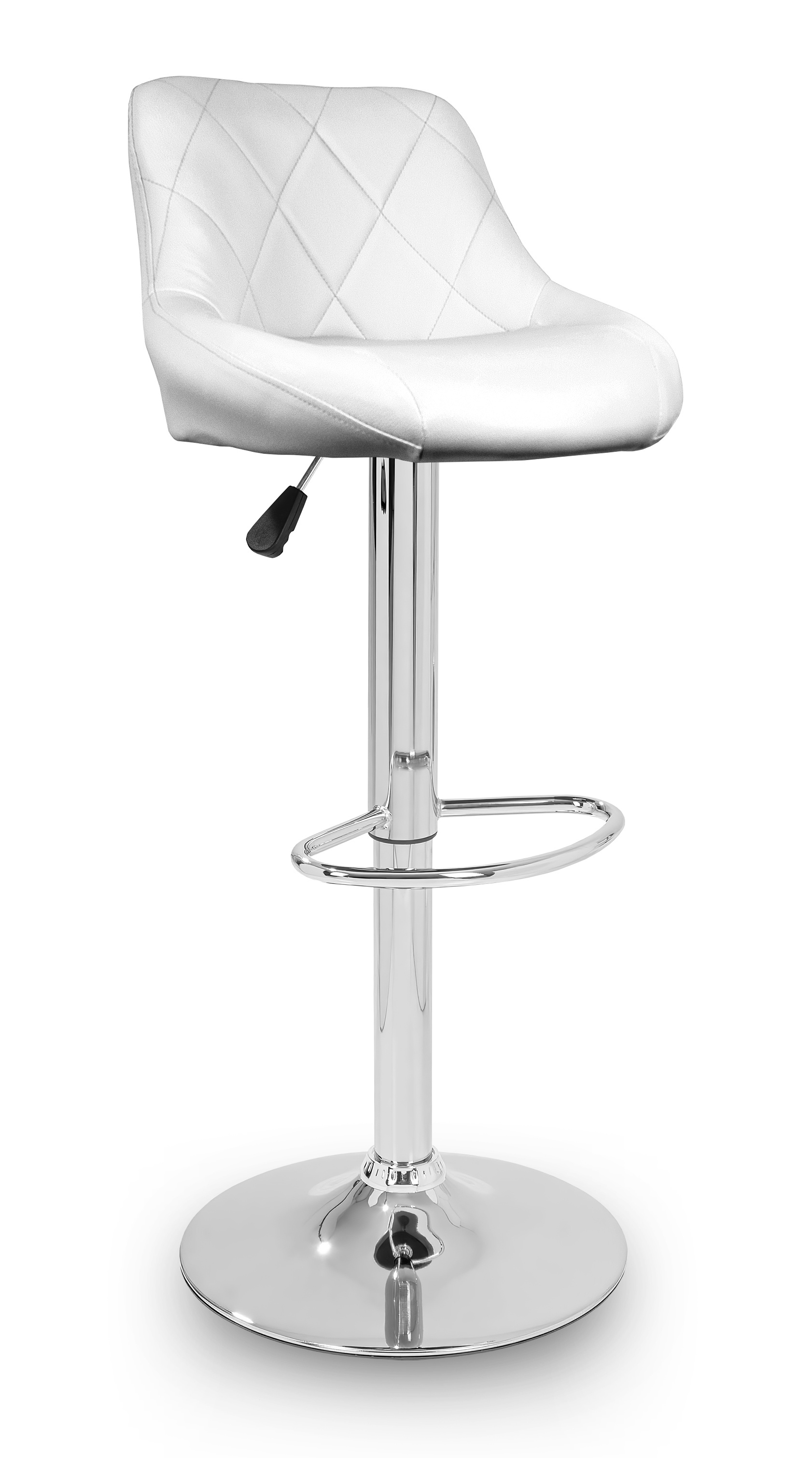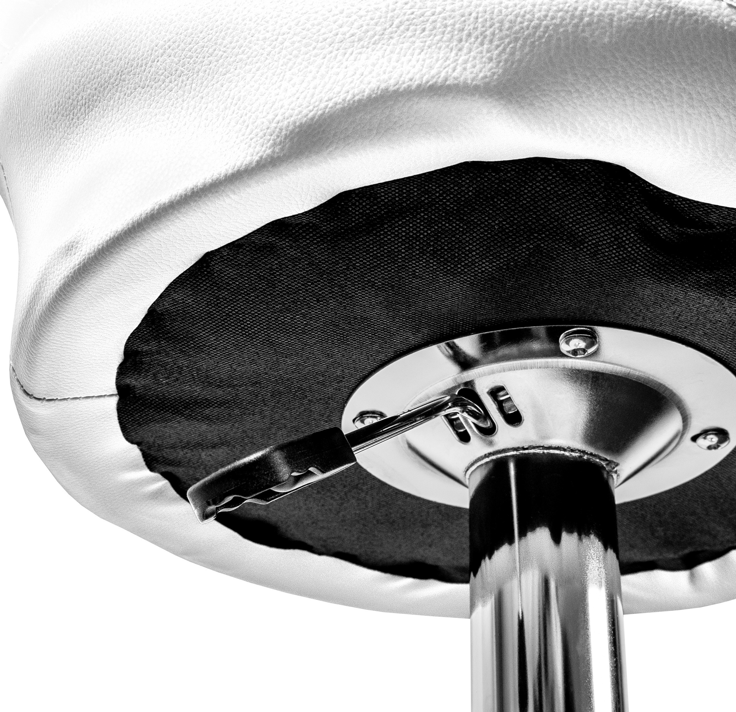 Židle má praktickou opěrku na nohy z pochromovaného kovu. Kruhová podnož a centrální noha jsou z chromu v lesku.