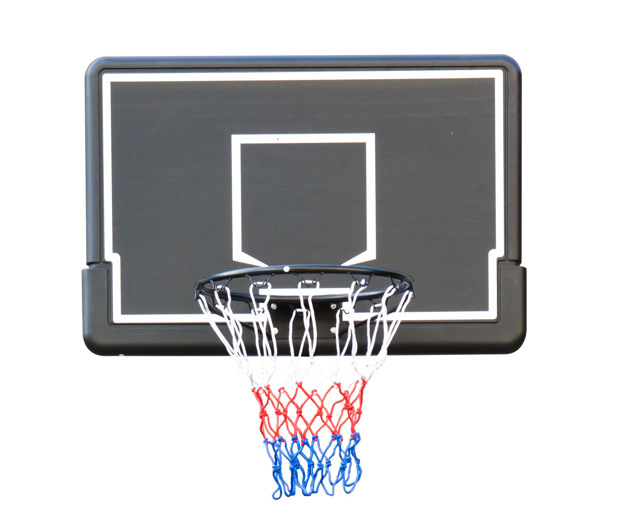 Deska koše je vyrobená sendvičovou technologií z pevného plastu tloušťky 2,6 mm a zpevňujícími kovovými tyčemi tvaru V pro bezpečné a pevné upevnění na zdi.
