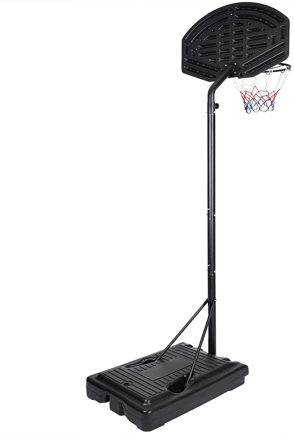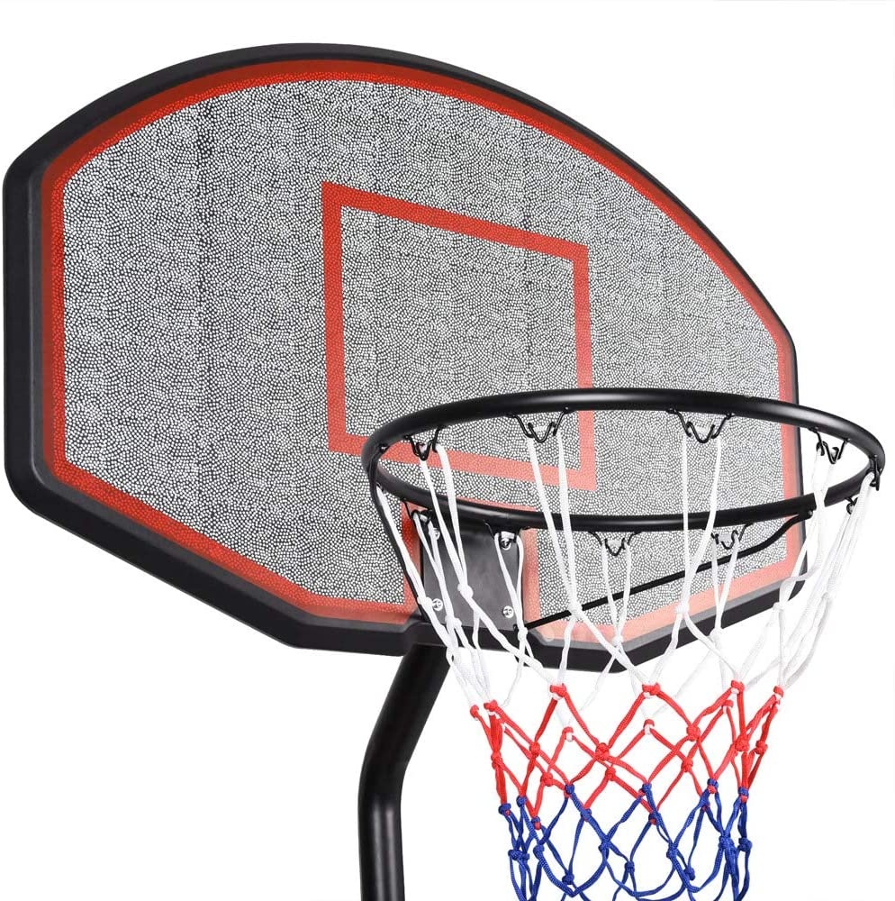 Mobilní basketbalový koš s nastavitelnou výškou, pevnou plastovou deskou a obroučkou se sítí.