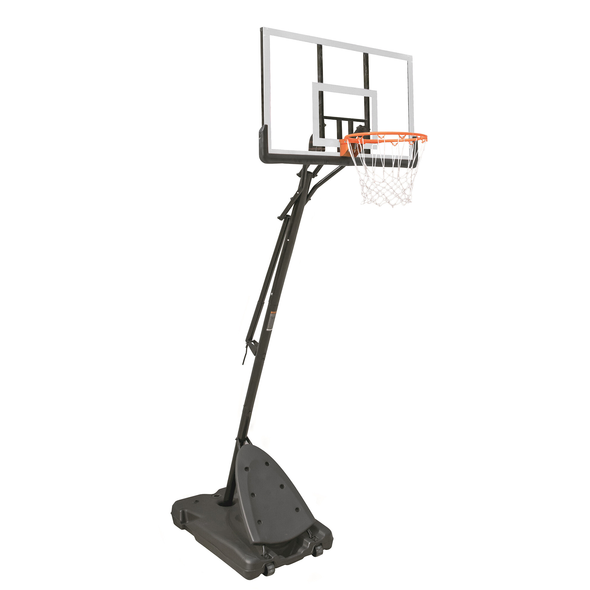 Mobilní basketbalový koš s nastavitelnou výškou, pevnou plastovou deskou a obroučkou se sítí, která má oficiální rozměr.