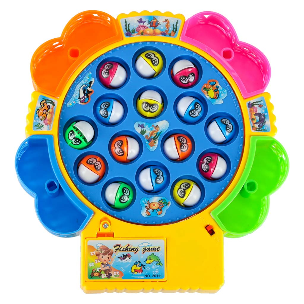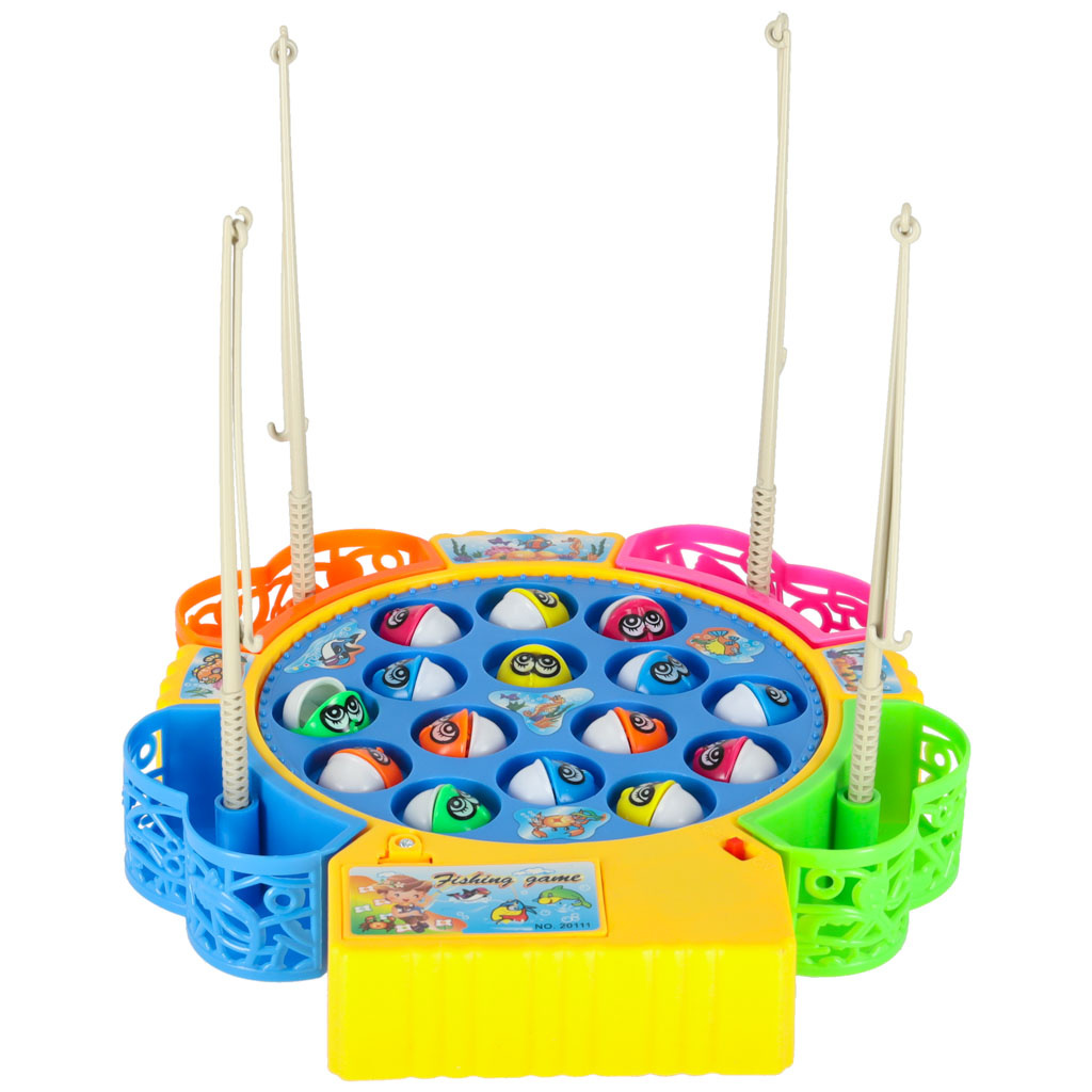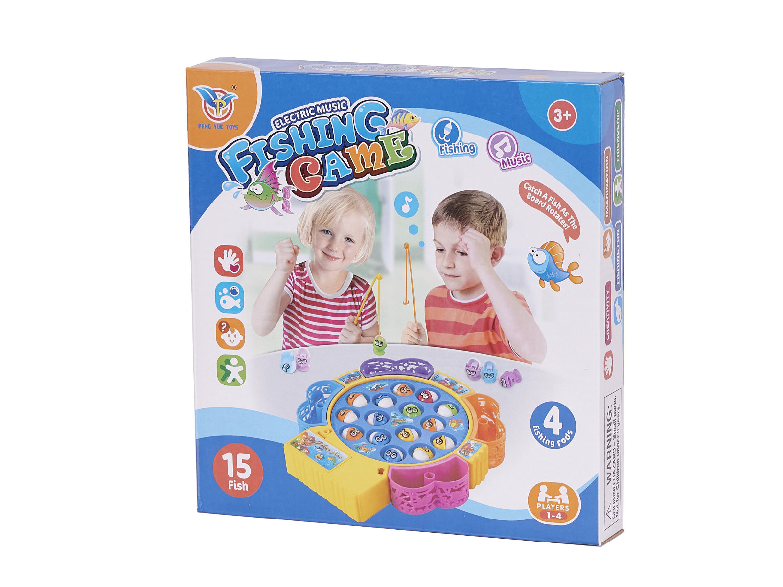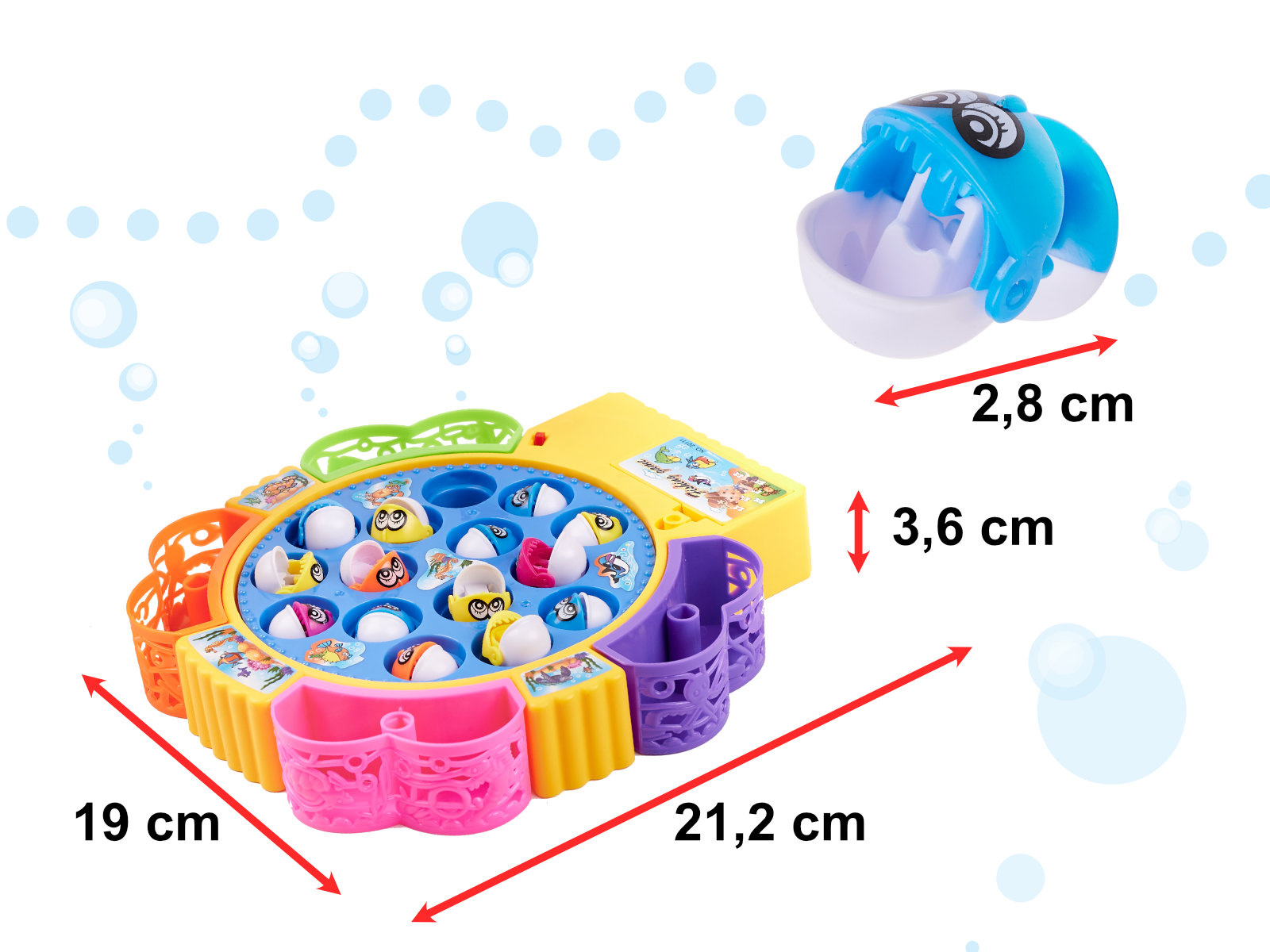 Rodinná hra na ryby. Obsahuje: stojan, 15 ryb a 4 rybářské pruty. Napájení: 2 baterie AA 1,5 V (nejsou součástí dodávky). Rozměry základny: 21x20x3,5 cm.Celý popis