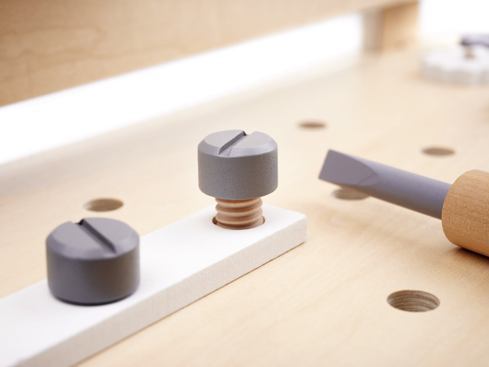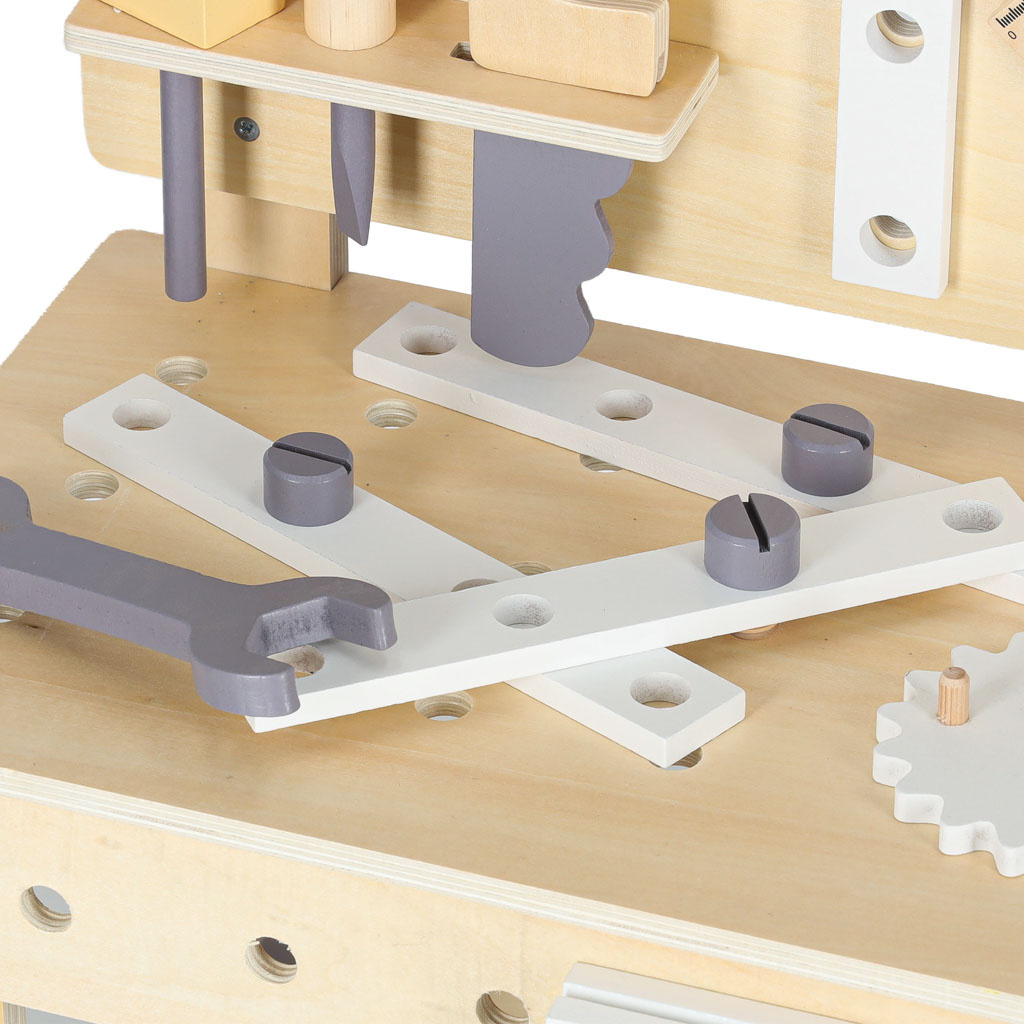 Senzační workshop s nástroji. Splněný sen malého kutila. Podporuje logické myšlení a stimuluje kreativitu. Obsahuje: stůl, pilu, šroubovák, 11 šroubů, 6 krytek, svěrák, klíč, převody, metr, kladivo. Rozměry.45x26x67 cm.Celý popis