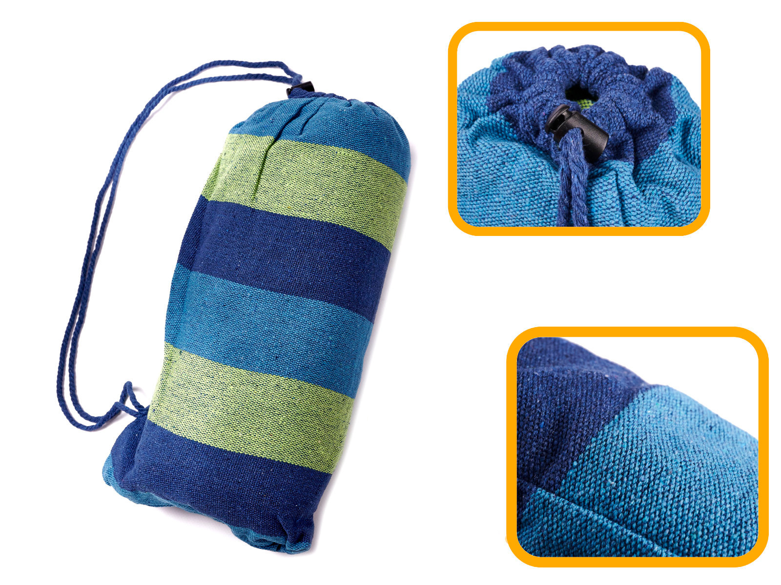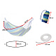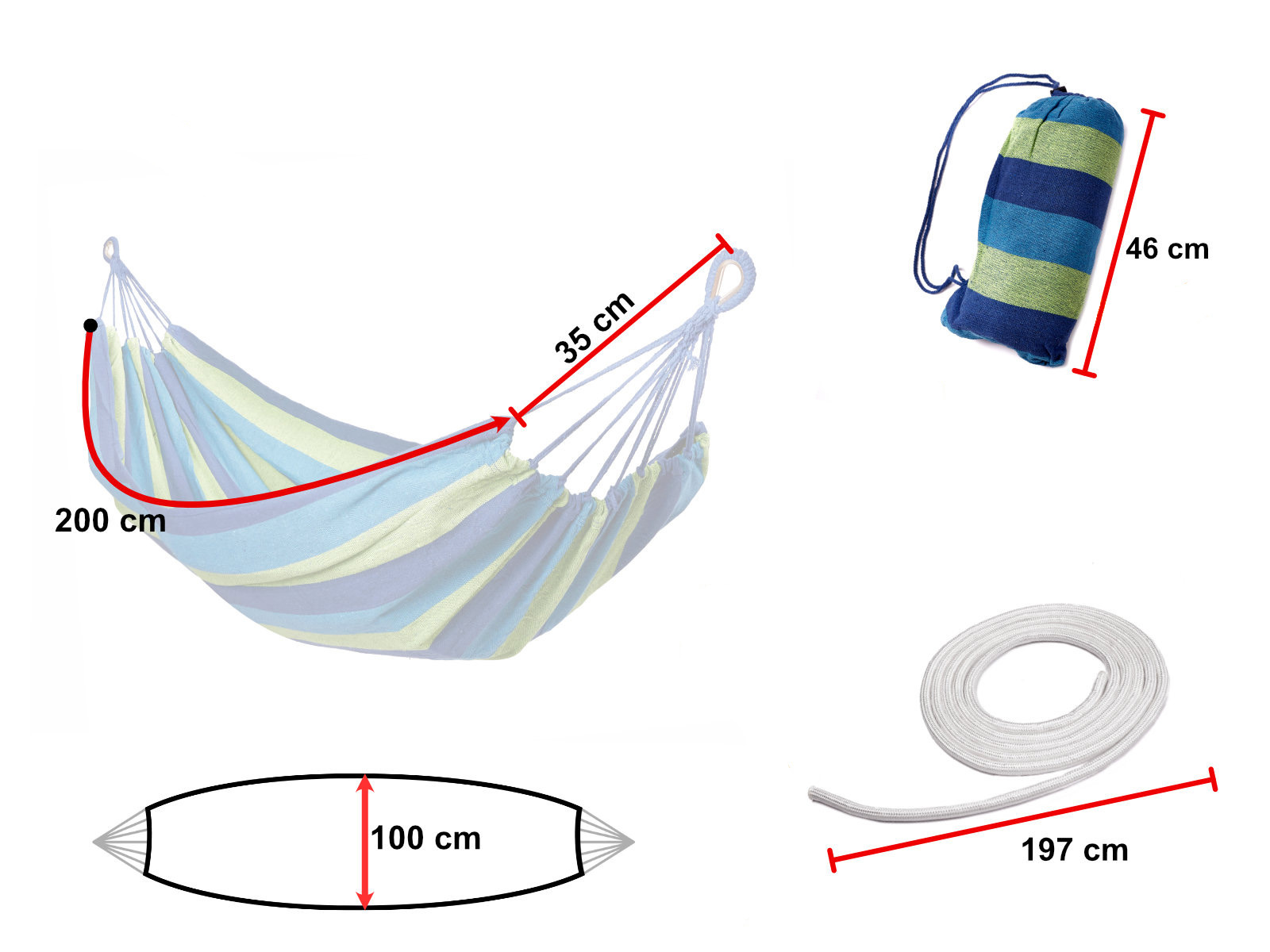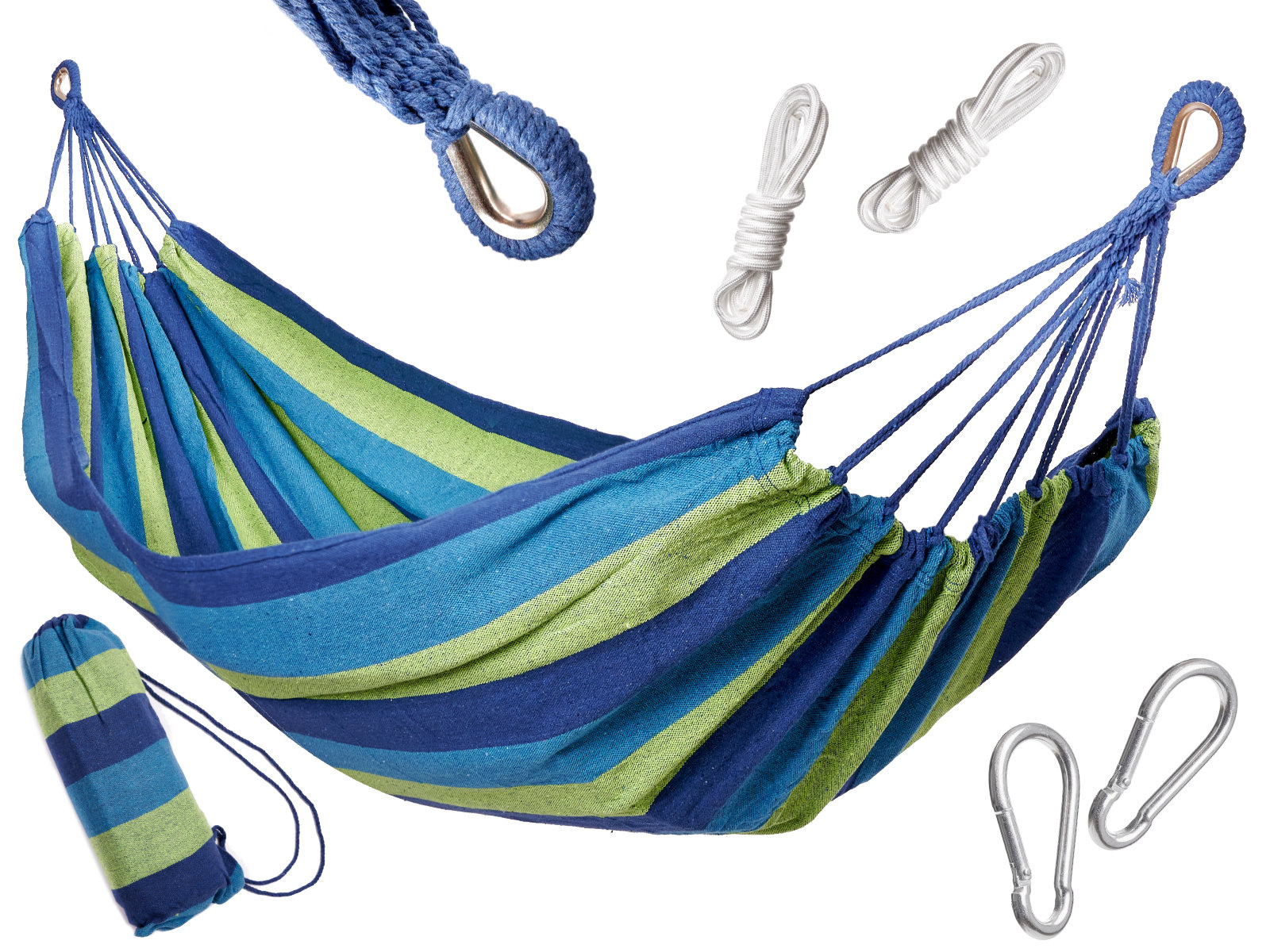 Pletená houpací síť pro jednu osobu s montážní sadou. Má dřevěné tyče, silná lana a smyčky vyztužené kovovými karabinami. Součástí balení: houpací síť, 2 lana, 2 karabiny. Maximální zatížení: až 150 kg. Barva: modrozelená. Rozměry: 200x100 cm.
