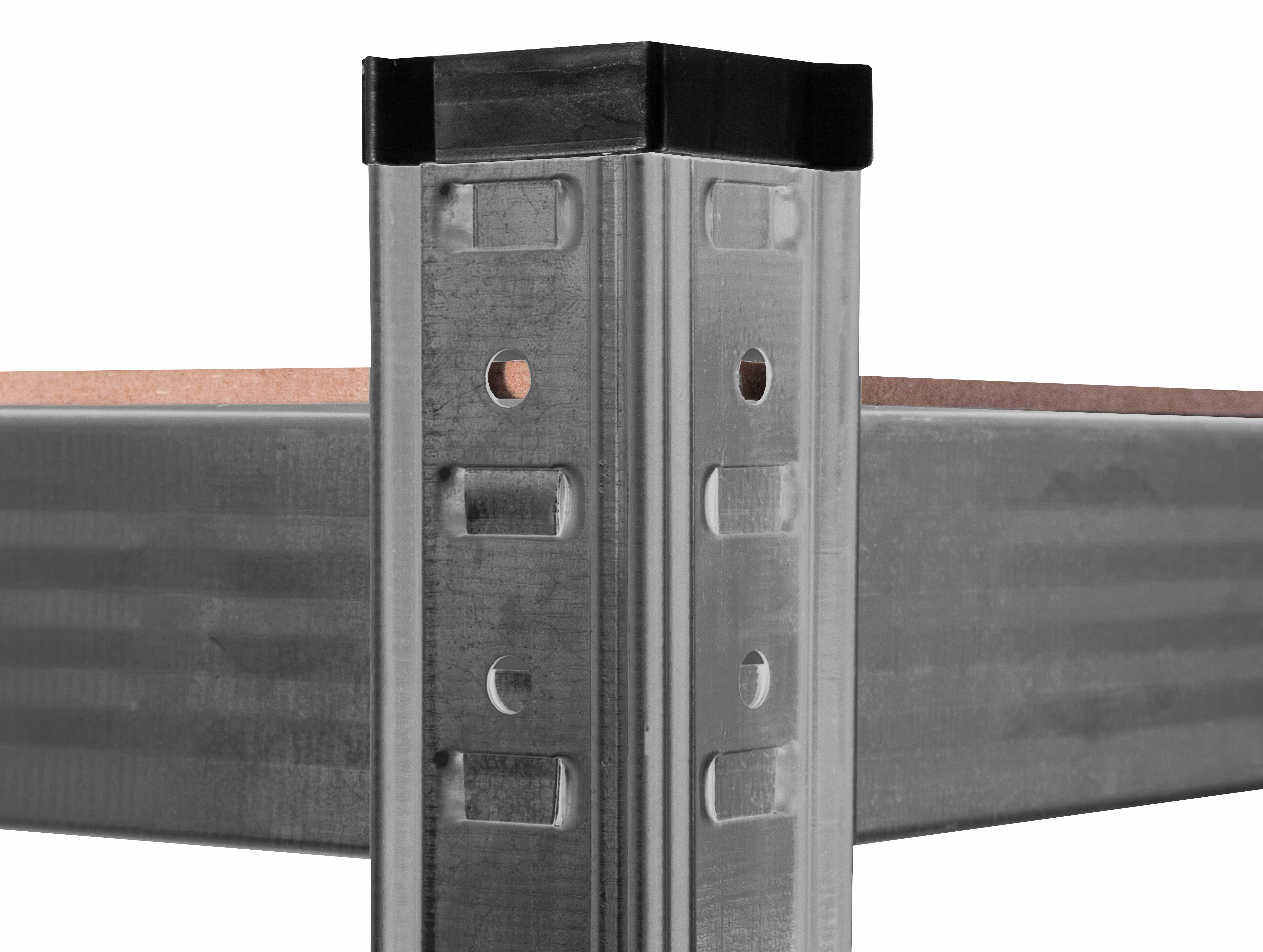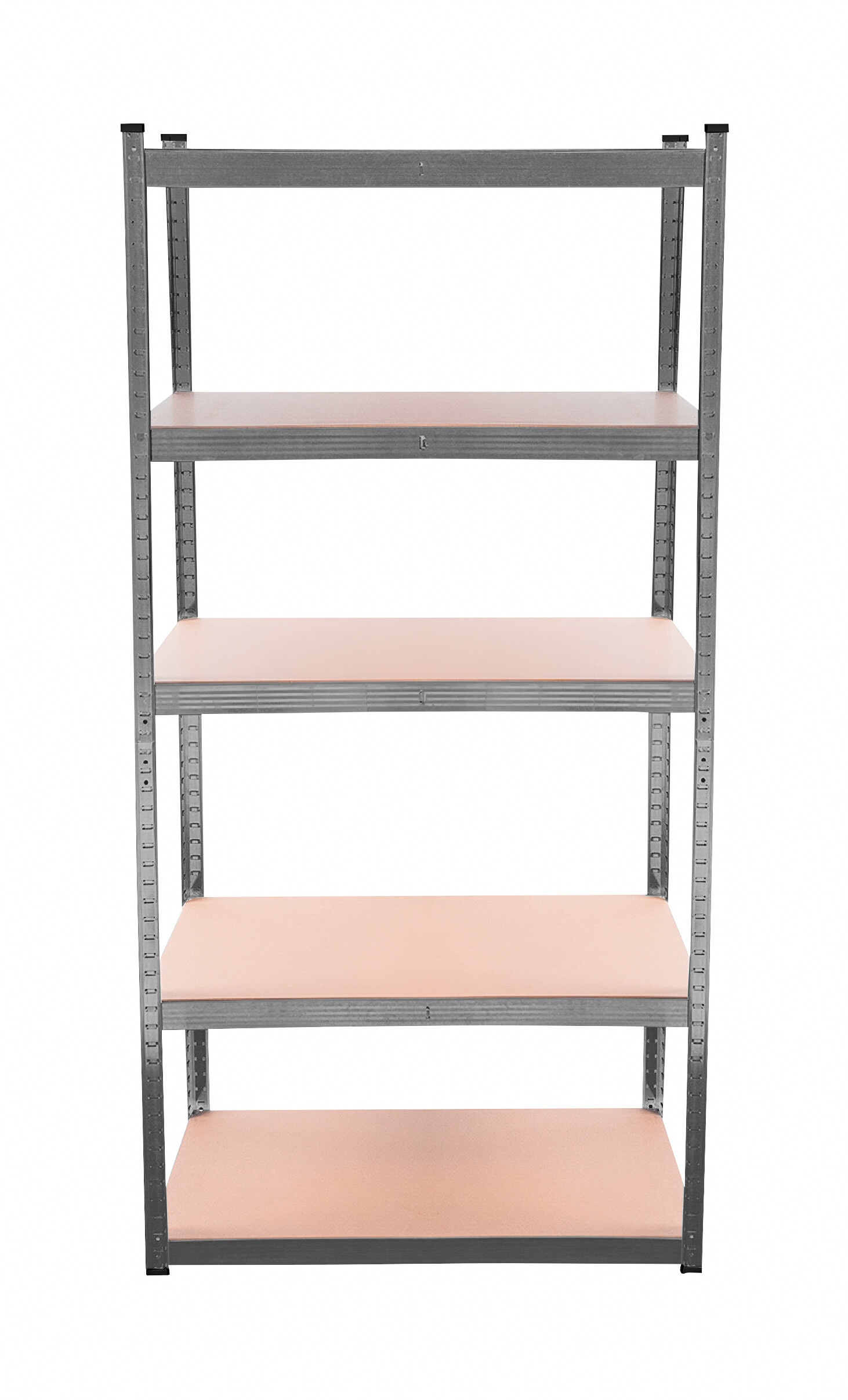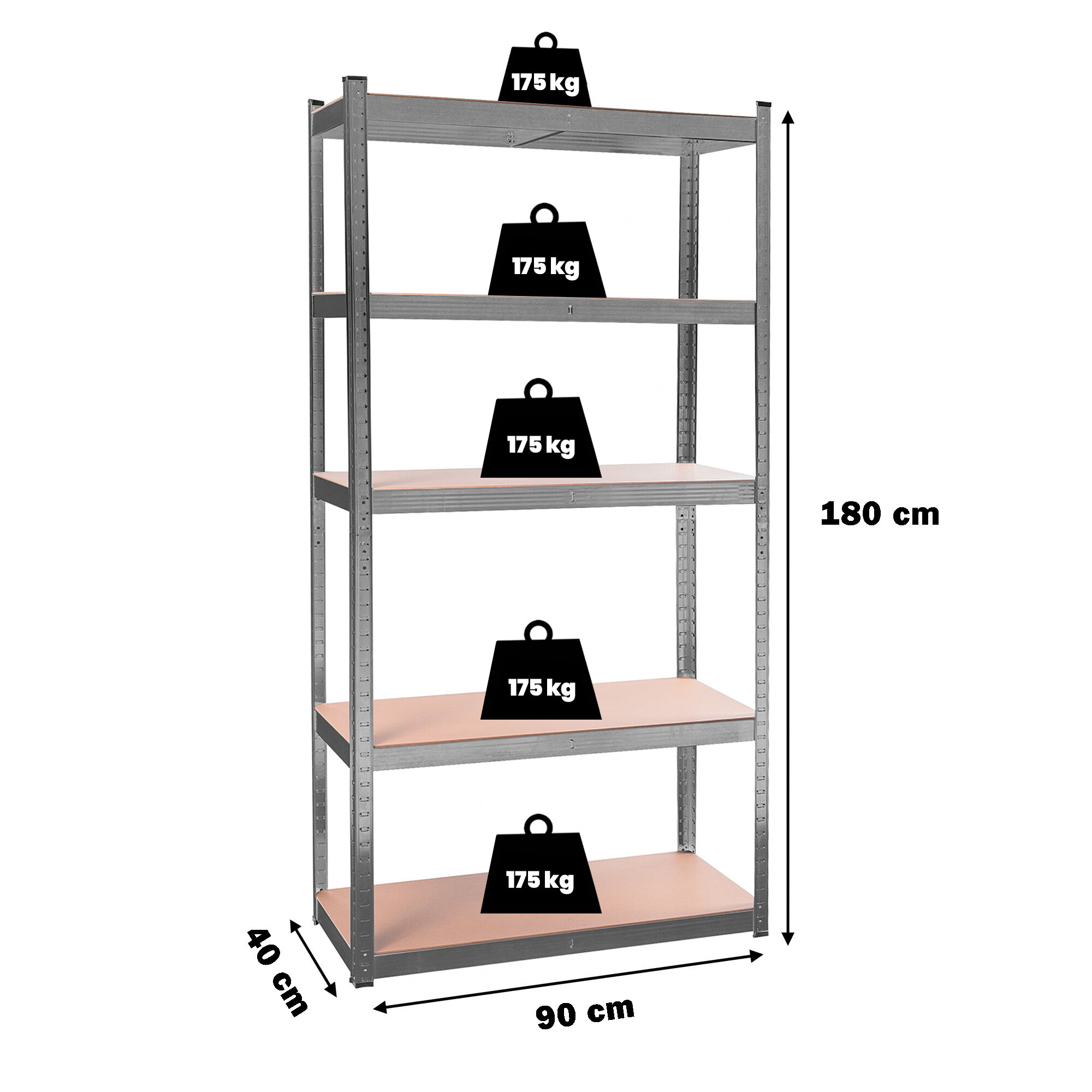 Na výšce cca 180 cm máte k dispozici 5 polic z mdf, které lze výškově vložit dle potřeby. Rám z galvanizované oceli v černé barvě zaručuje stabilitu a velkou nosnost cca 875 kg (na každou polici připadá cca 175 kg).