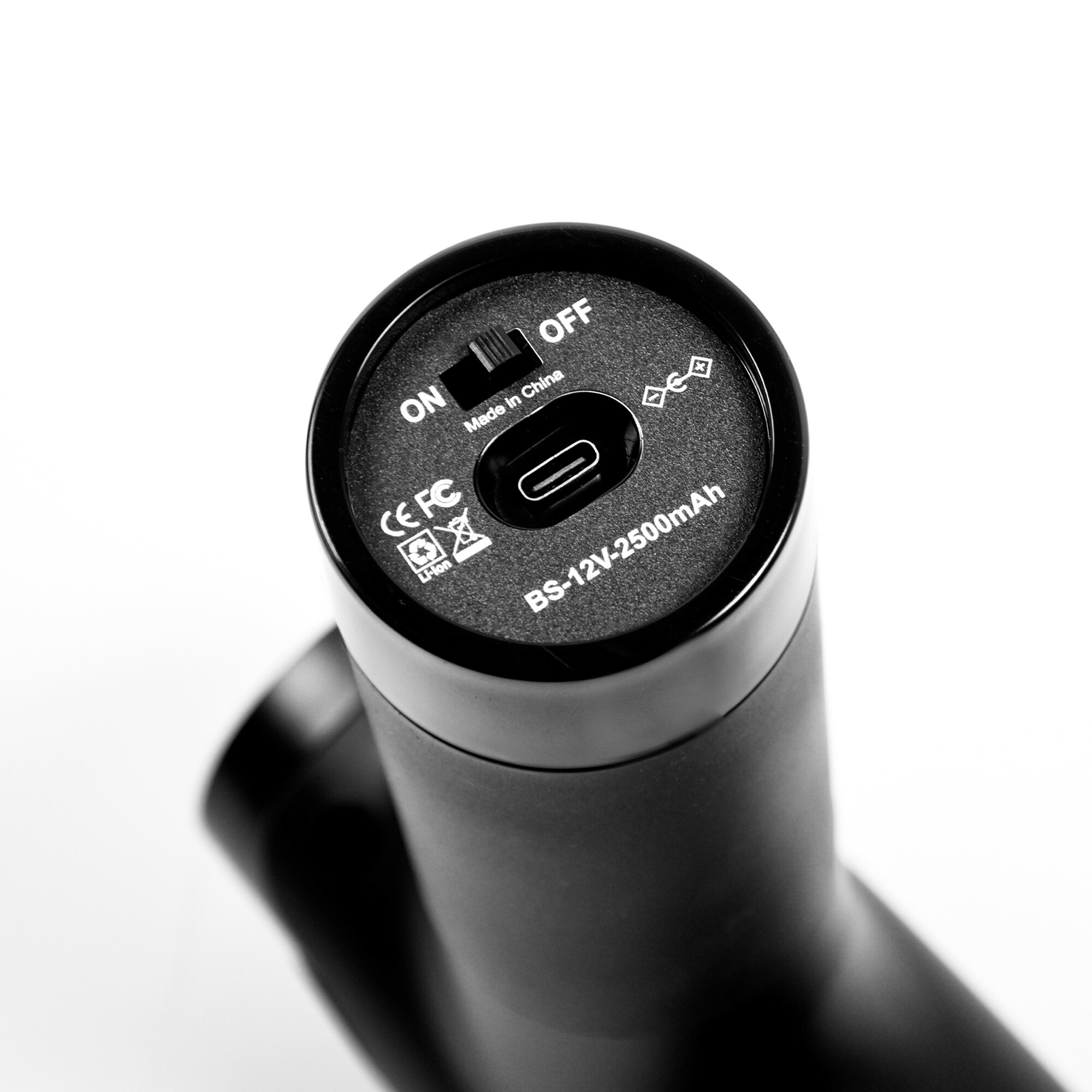 Masážní pistole má zabudovanou Lithium-iontovou baterii o kapacitě 2500mAh, která vydrží na jedno nabití až 3 hodin, podle používaného rychlostního stupně.