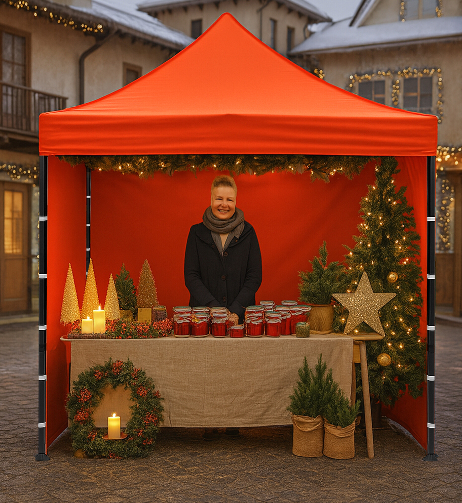 Střecha z 420D PU Oxfordu a bočnice z PVC Oxford 210D poskytují ochranu před větrem i deštěm a zároveň vytvářejí reprezentativní zázemí pro prodejce i zákazníky. Díky praktickému suchému zipu lze bočnice rychle sejmout nebo znovu upevnit.