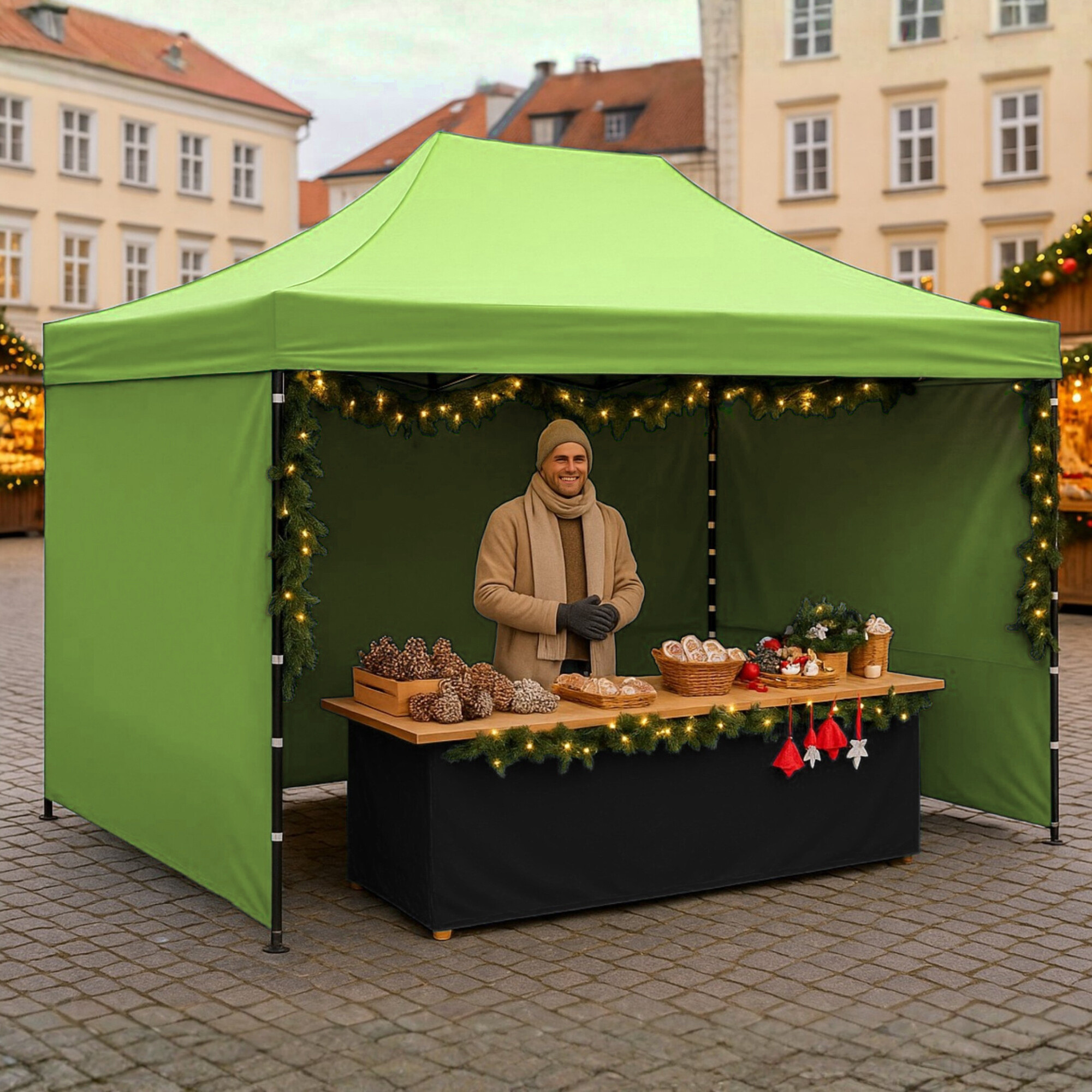 Prodejní stánek 3×4,5 m s pevnou ocelovou nůžkovou konstrukcí a odnímatelnými bočnicemi. Nabízí velký prostor, rychlé složení a univerzální využití venku i uvnitř.Celý popis
