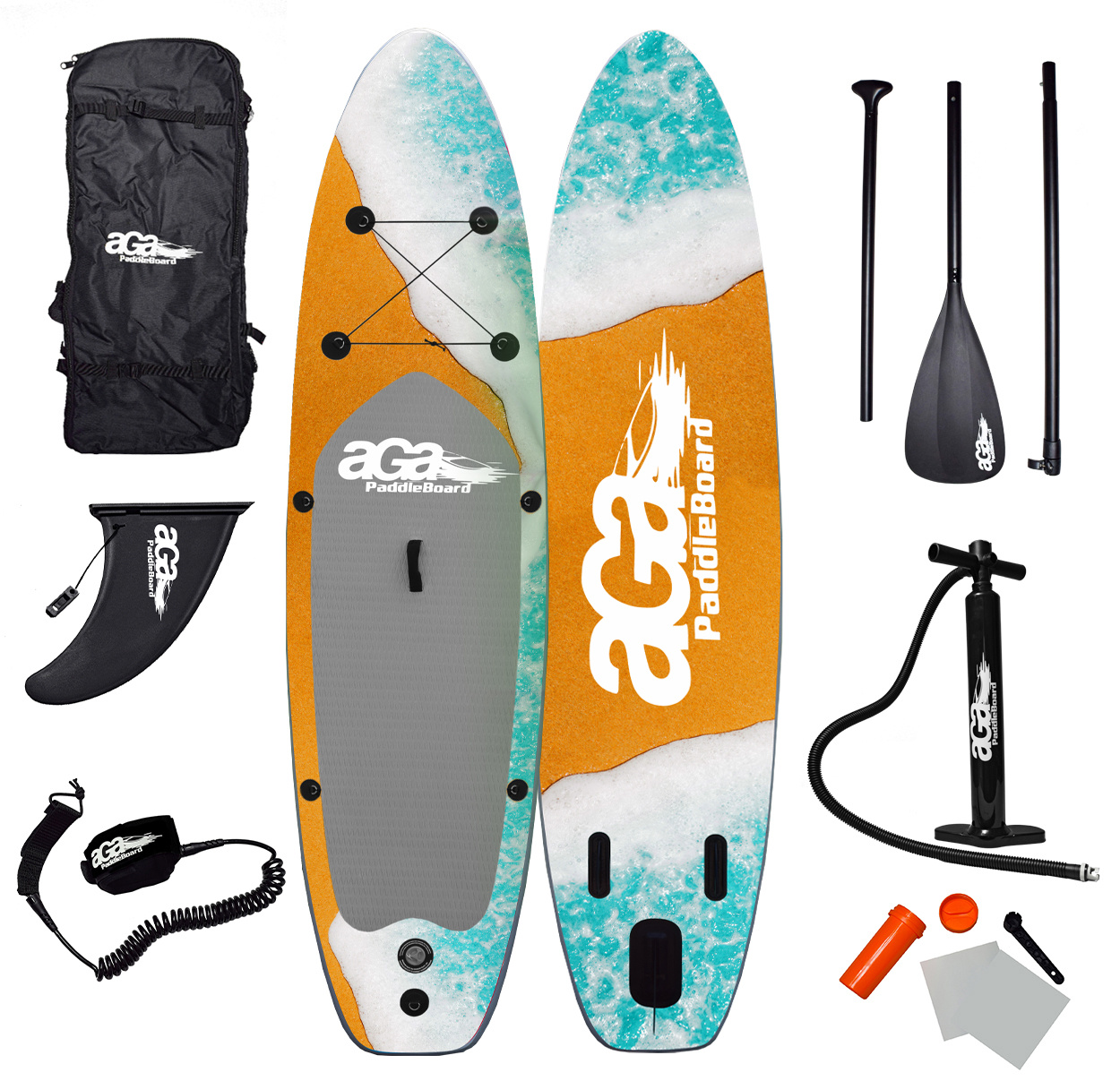 V balení najdete vše, co pro vyražení na vodu můžete potřebovat: trojdílné hliníkové pádlo s nastavitelnou délkou, pumpu s tlakoměrem, držák na kameru, bezpečnostní lanko na nohu - leash, ploutev, opravná sada a taška na přenos paddleboardu.