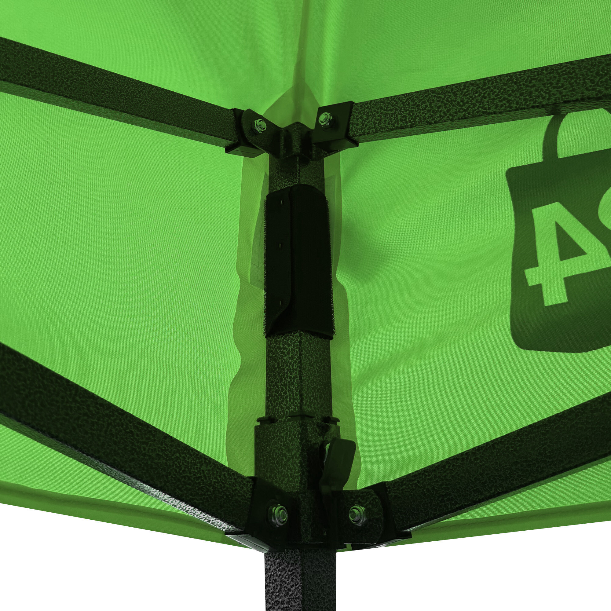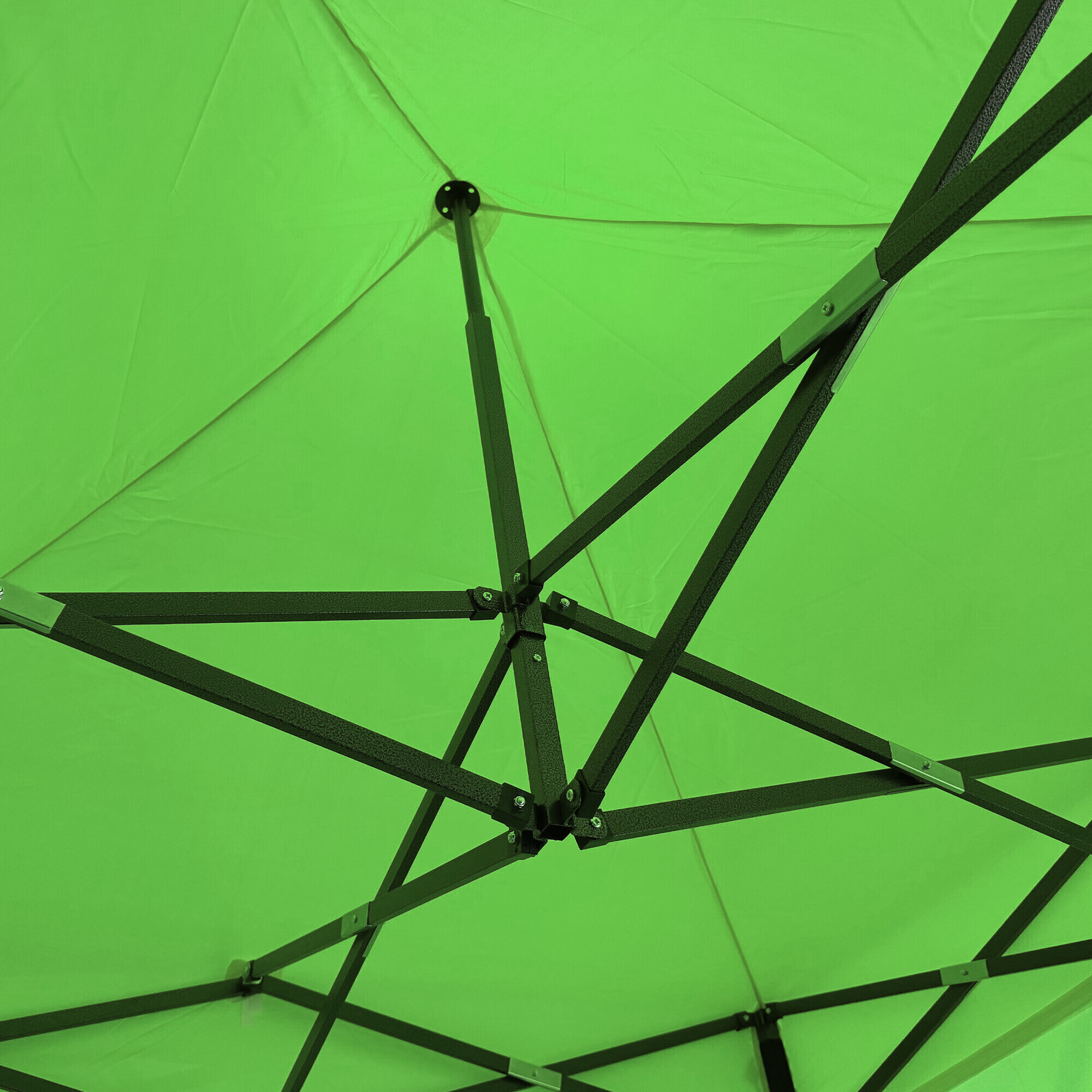 Konstrukci tvoří ocelový rám s nůžkovým mechanismem, který je povrchově chráněn práškovým lakem proti korozi. Oproti běžným skládacím stanům má tento model šroubované spoje, což zvyšuje pevnost, prodlužuje životnost a usnadňuje případný servis nebo výměnu dílů. Díky třem stupňům regulace lze výšku nastavit od 213 cm až do 290 cm, takže stánek snadno přizpůsobíte konkrétním podmínkám.