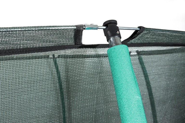 Horní ochranná síť má vstup opatřený zipem a zajištěným pojistkou proti samovolnému rozepnutí. Maximální možnou bezpečnost pak zajištuje polstrovaný obvodový pás, který překrývá pružiny po celém obvodu trampolíny.
