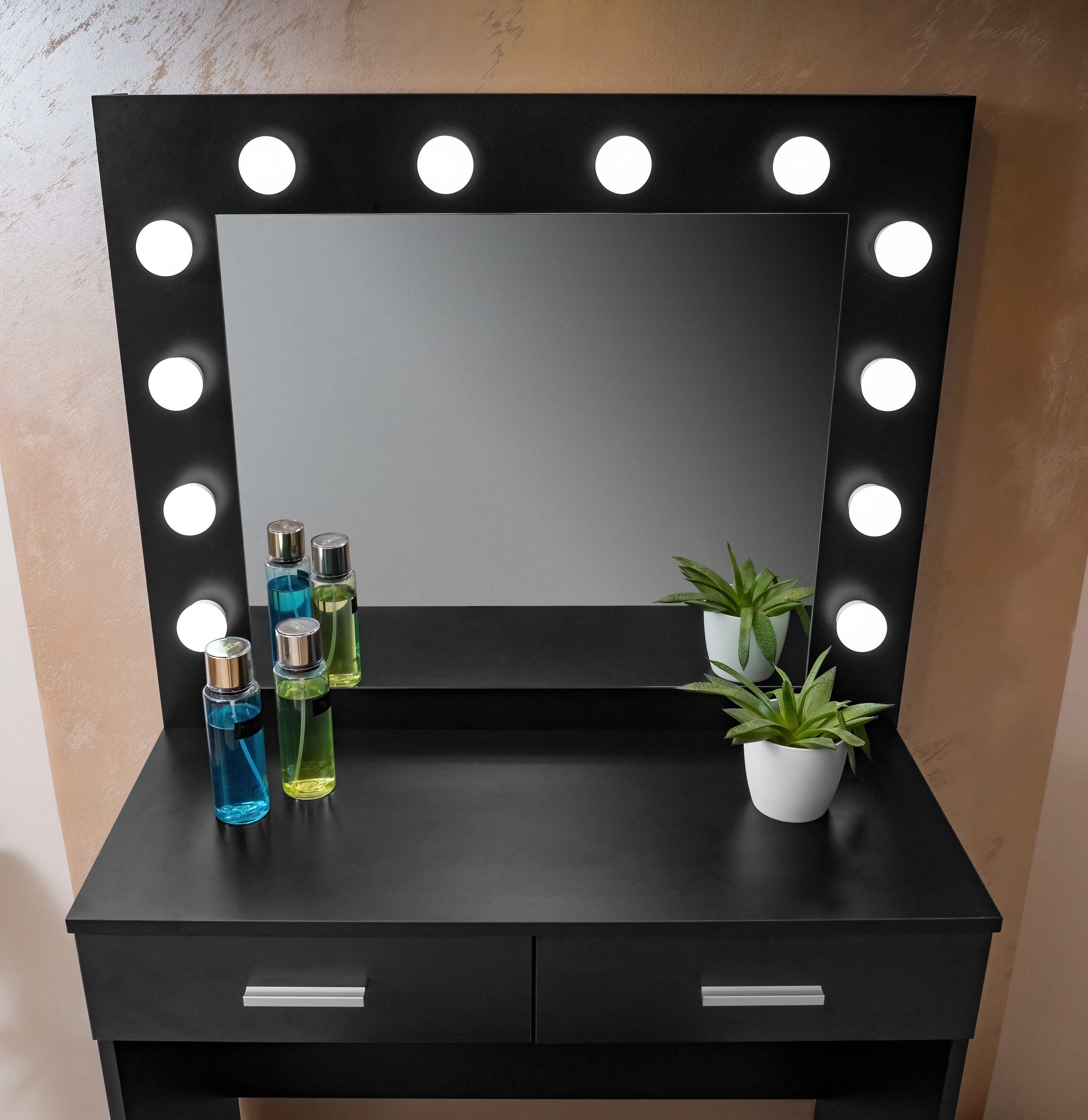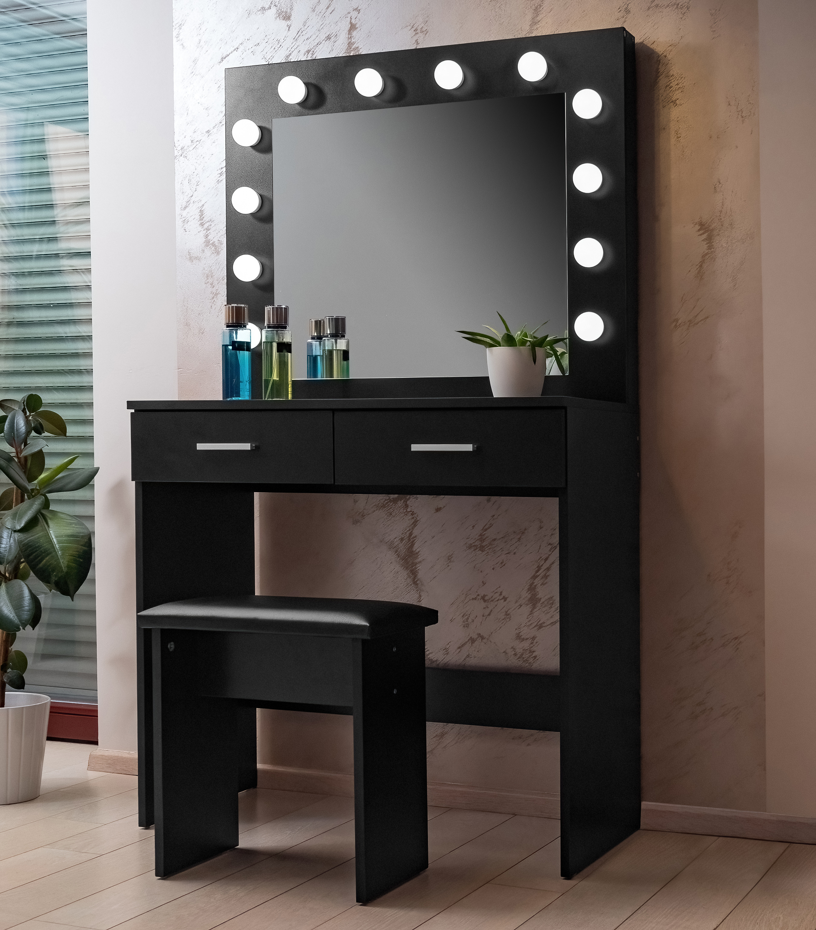 Na zrcadle je 12 LED žárovek, pohodlně se tedy nalíčíte i při špatném přirozeném světle. Taburet je vyrobený z vysoce kvalitní měkké a pěny, na které je možné sedět celé hodiny.