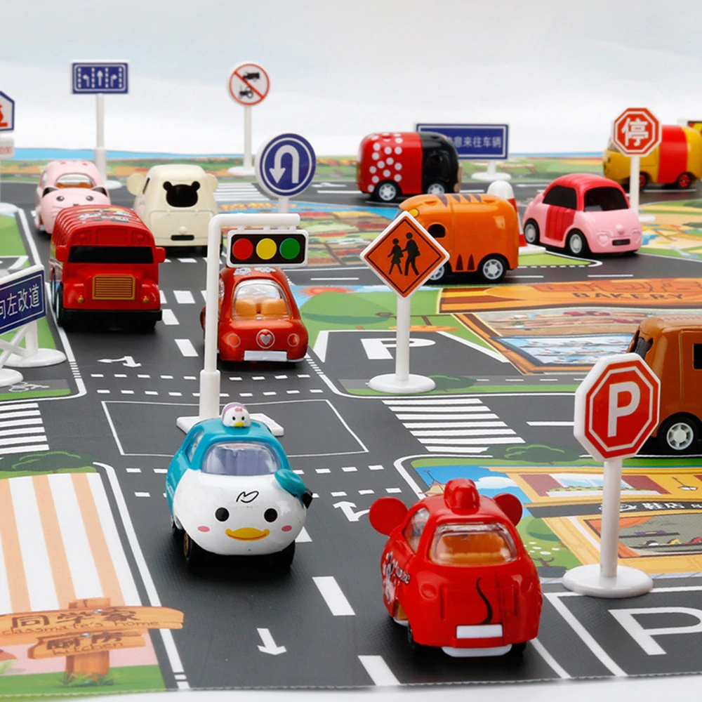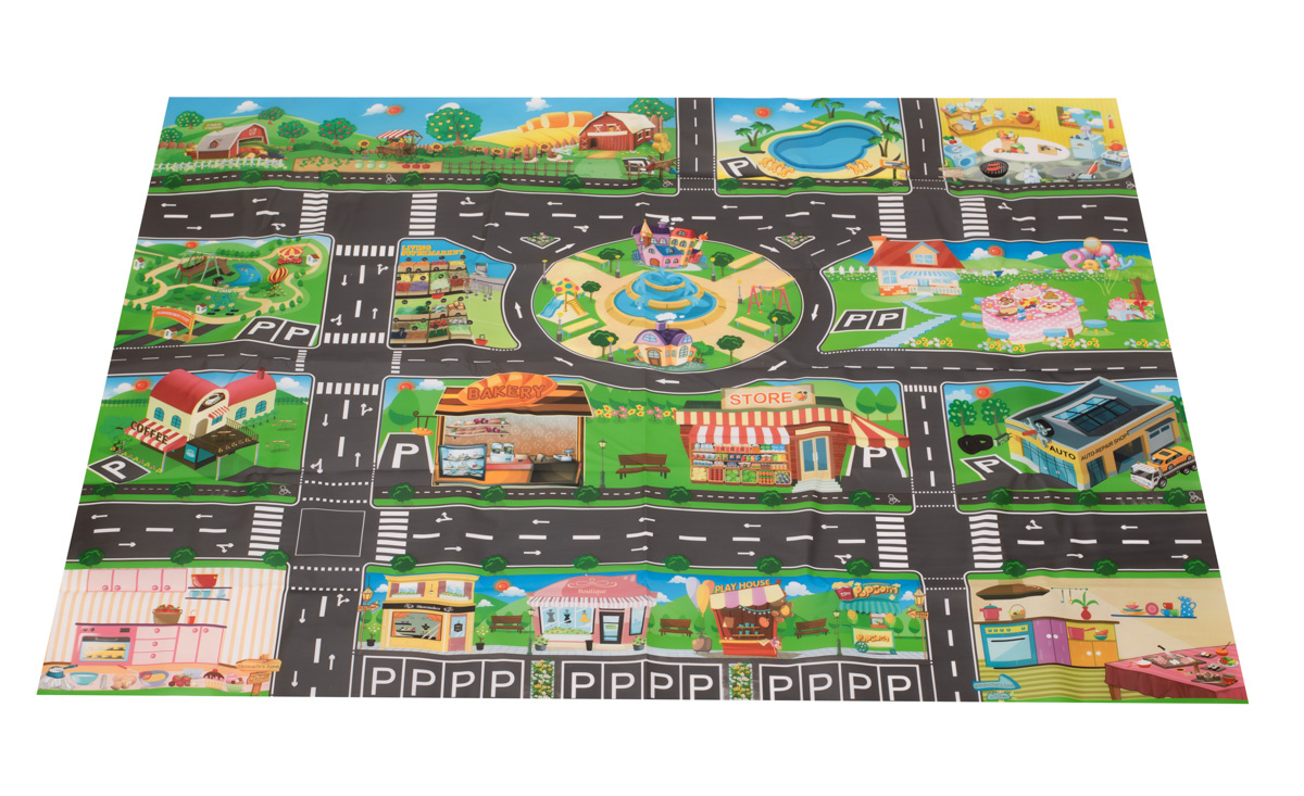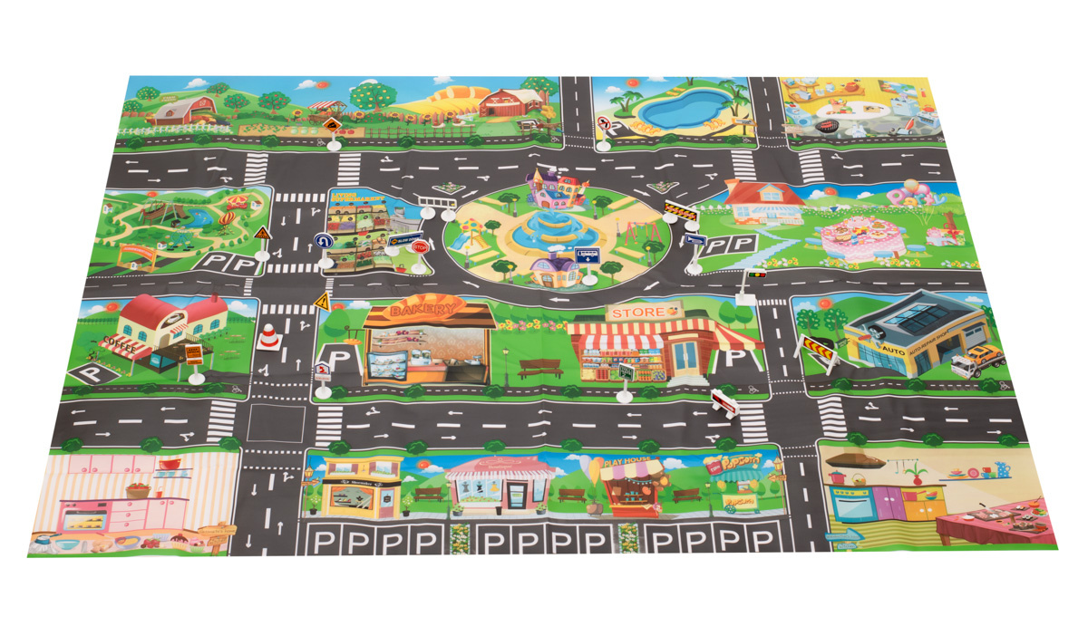 Velká voděodolná dětská podložka s městským designem a doplňky.Je vyroben z plastu podobného olejové tkanině, je velmi tenký a lehký. Sada obsahuje m.in. 18 různých dopravních značek a 18 samolepek. Rozměry: 130 x 100 cmCelý popis