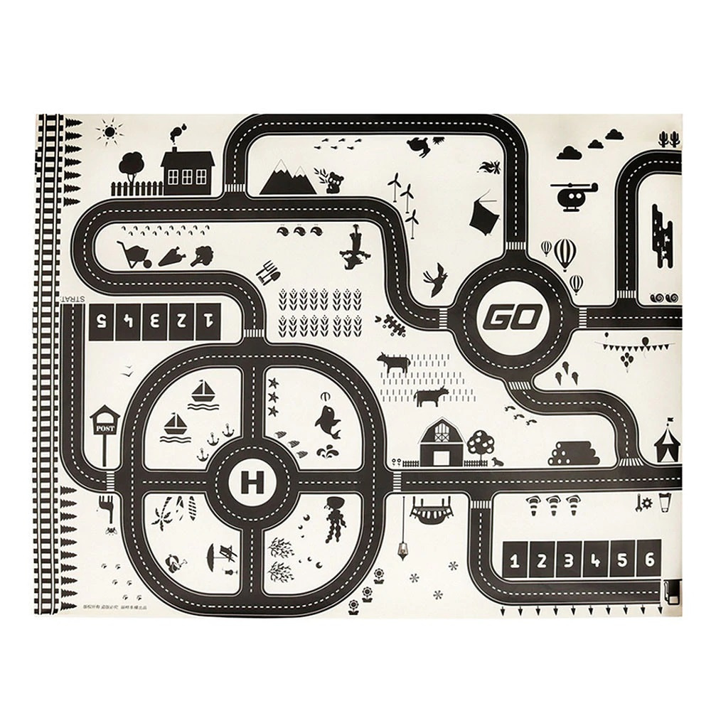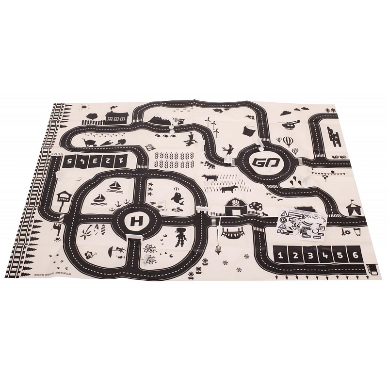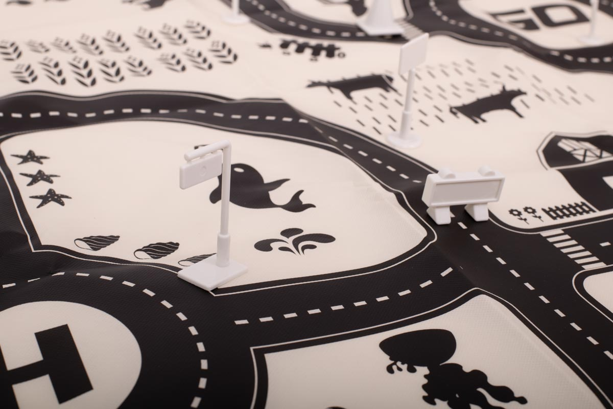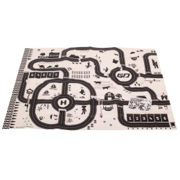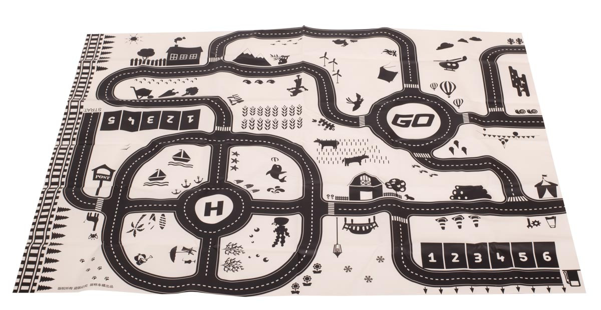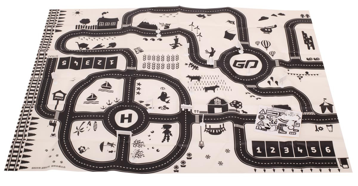 Voděodolná tenká rohož se vzorem města. Užitečné pro výuku dopravních předpisů. Vyrobeno z plastu podobného olejové látce. Obsahuje podložku, figurky dopravních značek a samolepky. K dispozici v krémové a černé barvě. Rozměry: 130x100 cm.Celý popis