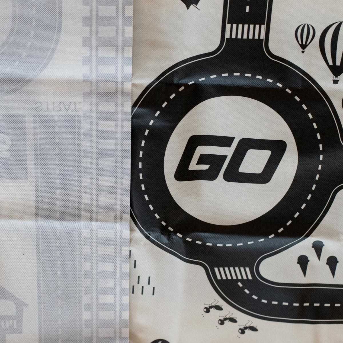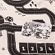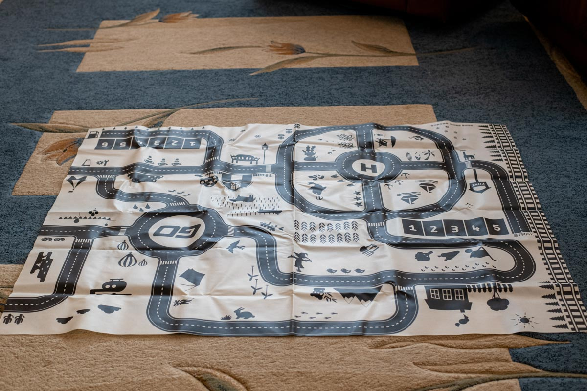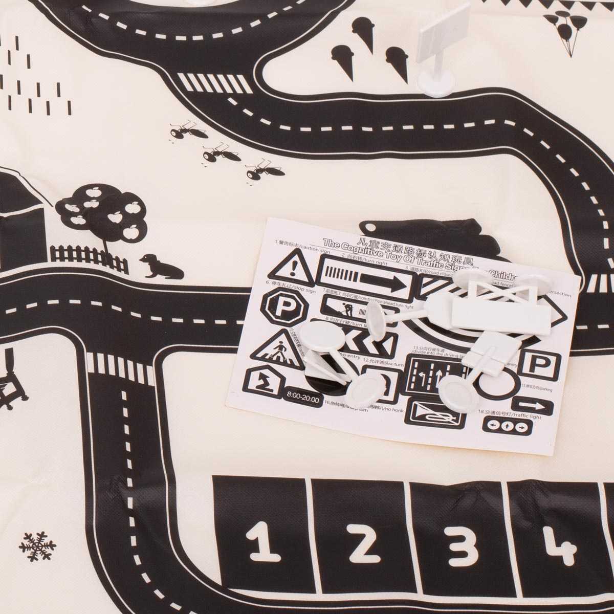 Voděodolná tenká rohož se vzorem města. Užitečné pro výuku dopravních předpisů. Vyrobeno z plastu podobného olejové látce. Obsahuje podložku, figurky dopravních značek a samolepky. K dispozici v krémové a černé barvě. Rozměry: 130x100 cm.Celý popis