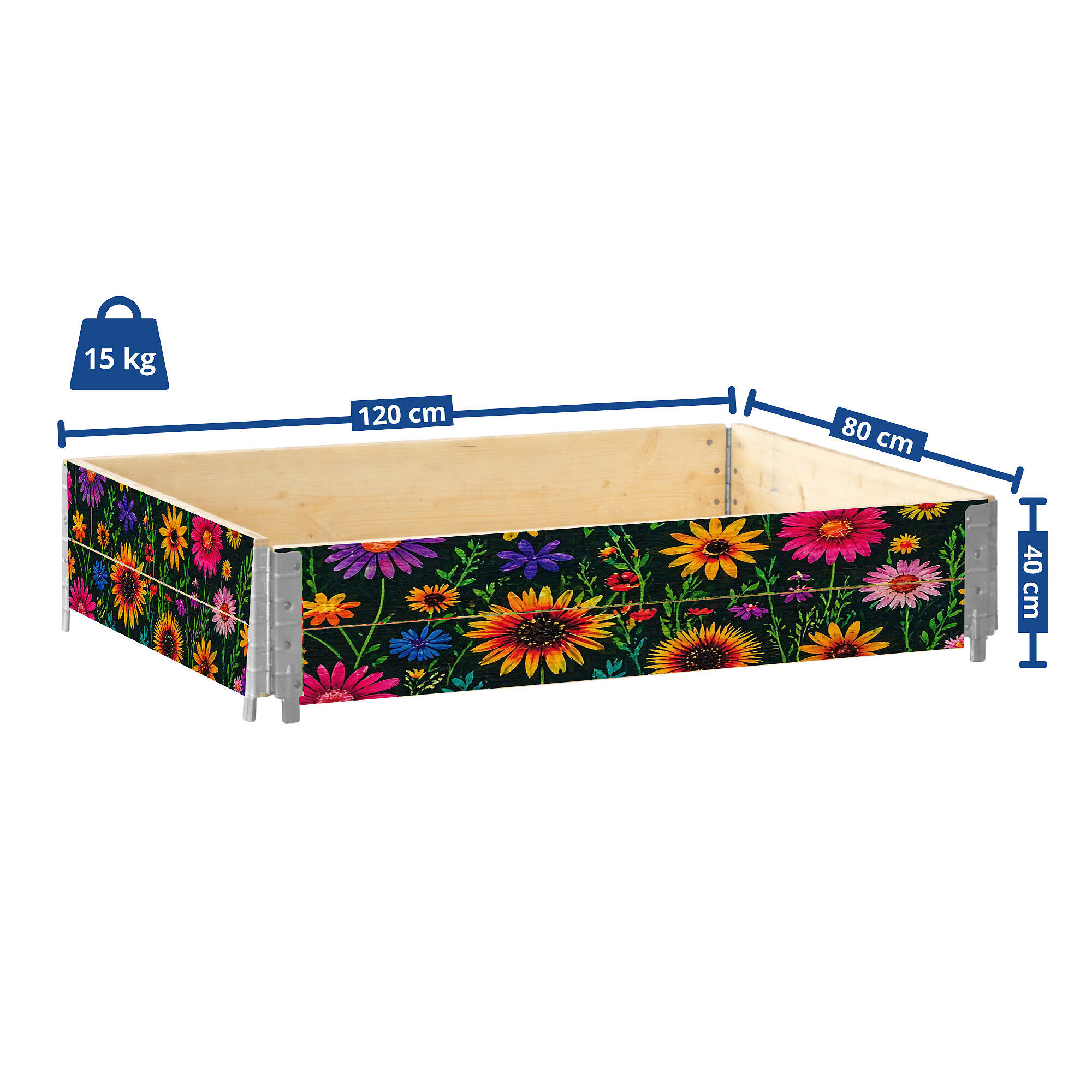 Záhon je vyroben z borovicového dřeva s certifikací IPPC. Vnější strana je doplněna grafikou květin, která zvýrazňuje jeho zahradní vzhled a dobře se hodí do venkovního prostředí. Rozměr 120 × 80 cm nabízí dostatek prostoru pro domácí pěstování běžných druhů zeleniny, bylinek, jahod i květin. Výška 40 cm umožňuje vytvořit vrstvu zeminy vhodnou pro různé typy výsadby.