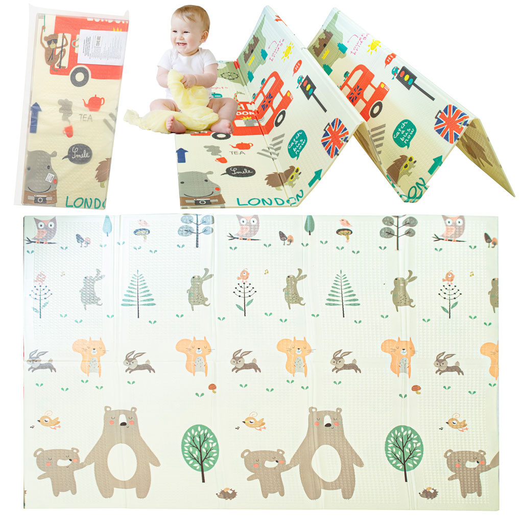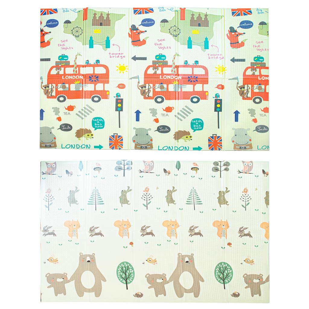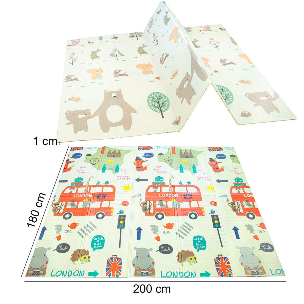 Měkká, velká, skládací, protiskluzová pěnová podložka. Lze jej použít jako hrací koberec. Na každé straně je jiný potisk. K dispozici v krémové barvě s potiskem sovy a dalších zvířat. Vyrobeno z voděodolné pěny. Rozměry: 200 x 180 cmCelý popis