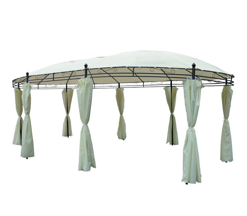 Zahradní altán vybavený pevnou a stabilní konstrukcí, v oválném provedení, se stahovatelnými závěsy.