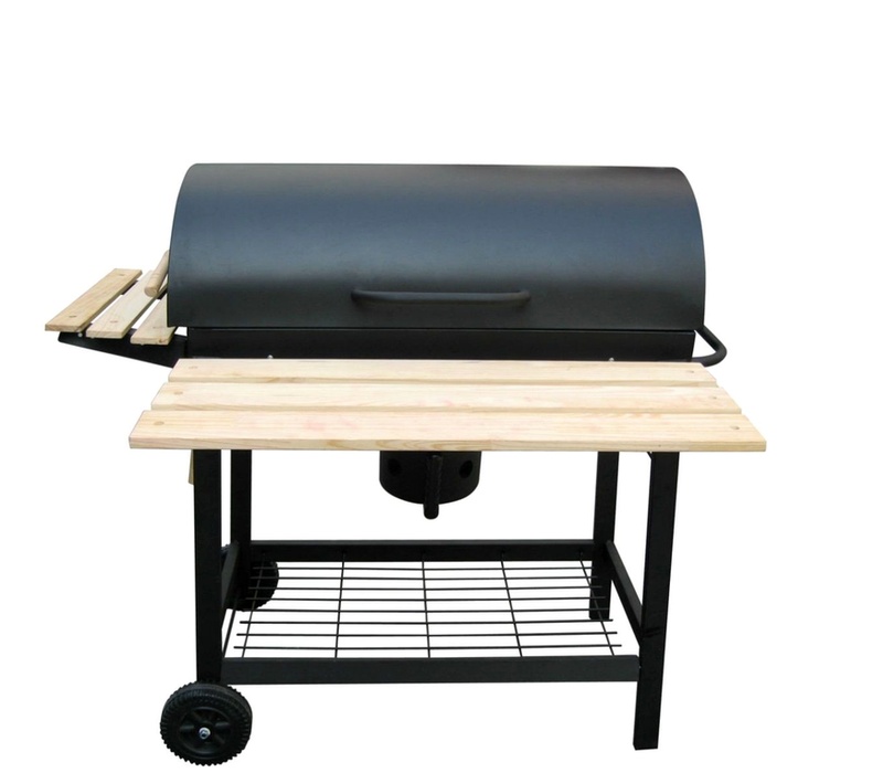 Hobby zahradní gril s poklopem na dřevěné uhlí nebo brikety, vyroben z plechu opatřeným žáruvzdorným nátěrem.