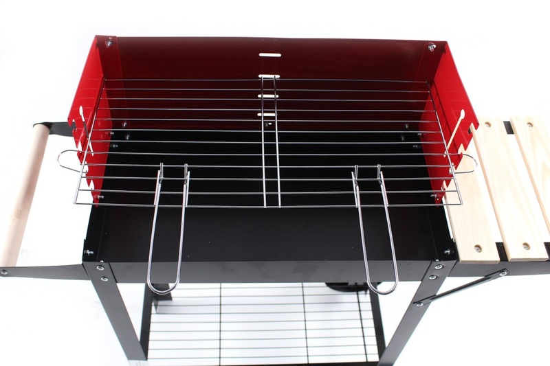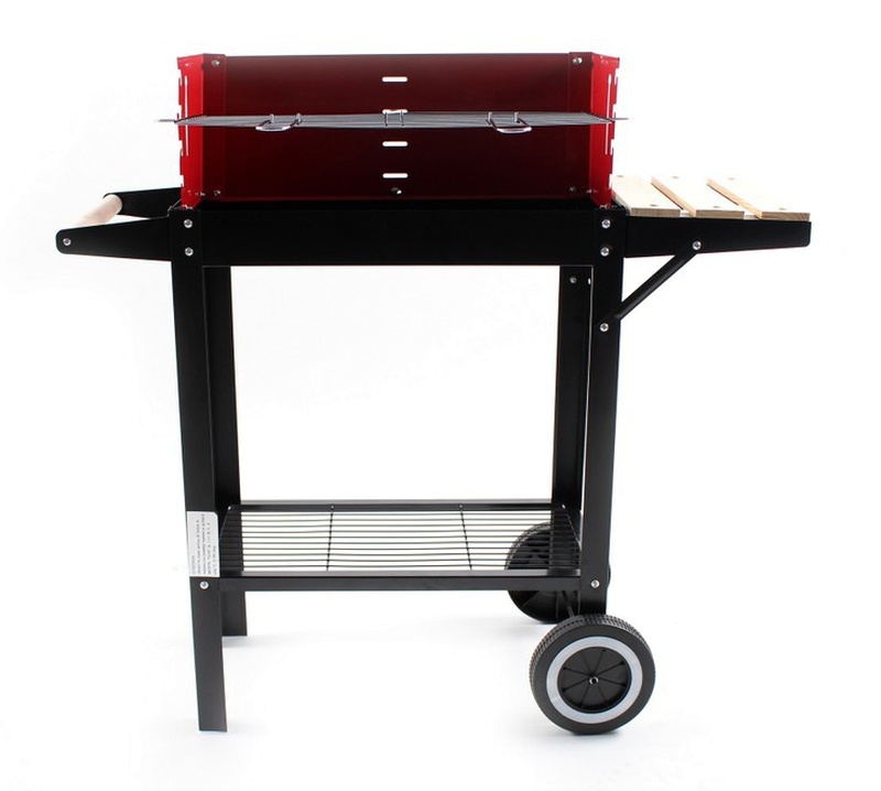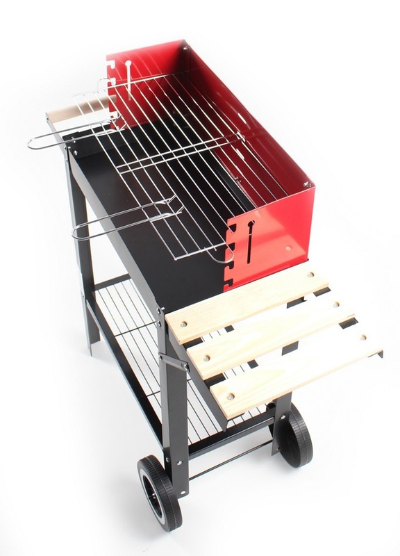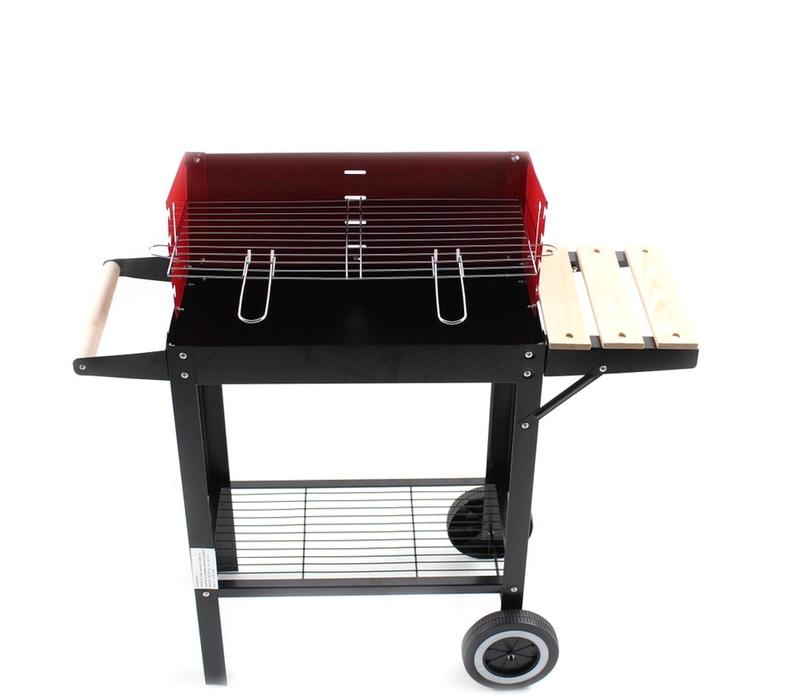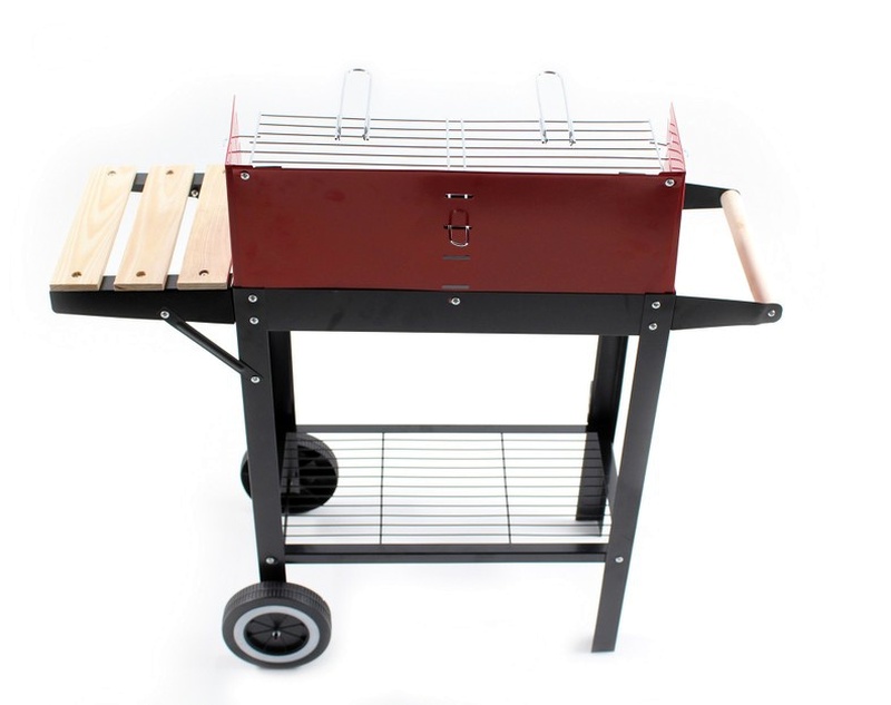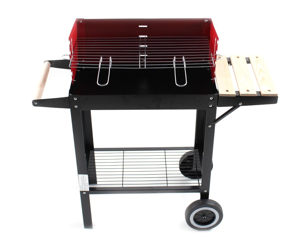 Aga zahradní gril na dřevěné uhlí vybaven obdélníkovým grilovacím roštem, spodní policí a dvěma transportními kolečky.