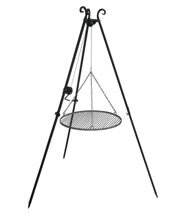 Výšku grilovacího roštu lze snadno upravit pomocí kladky umístěné v horní části trojnožky a háčků. Rošt o průměru 60 cm umožňuje grilování pokrmů i pro větší společnost.