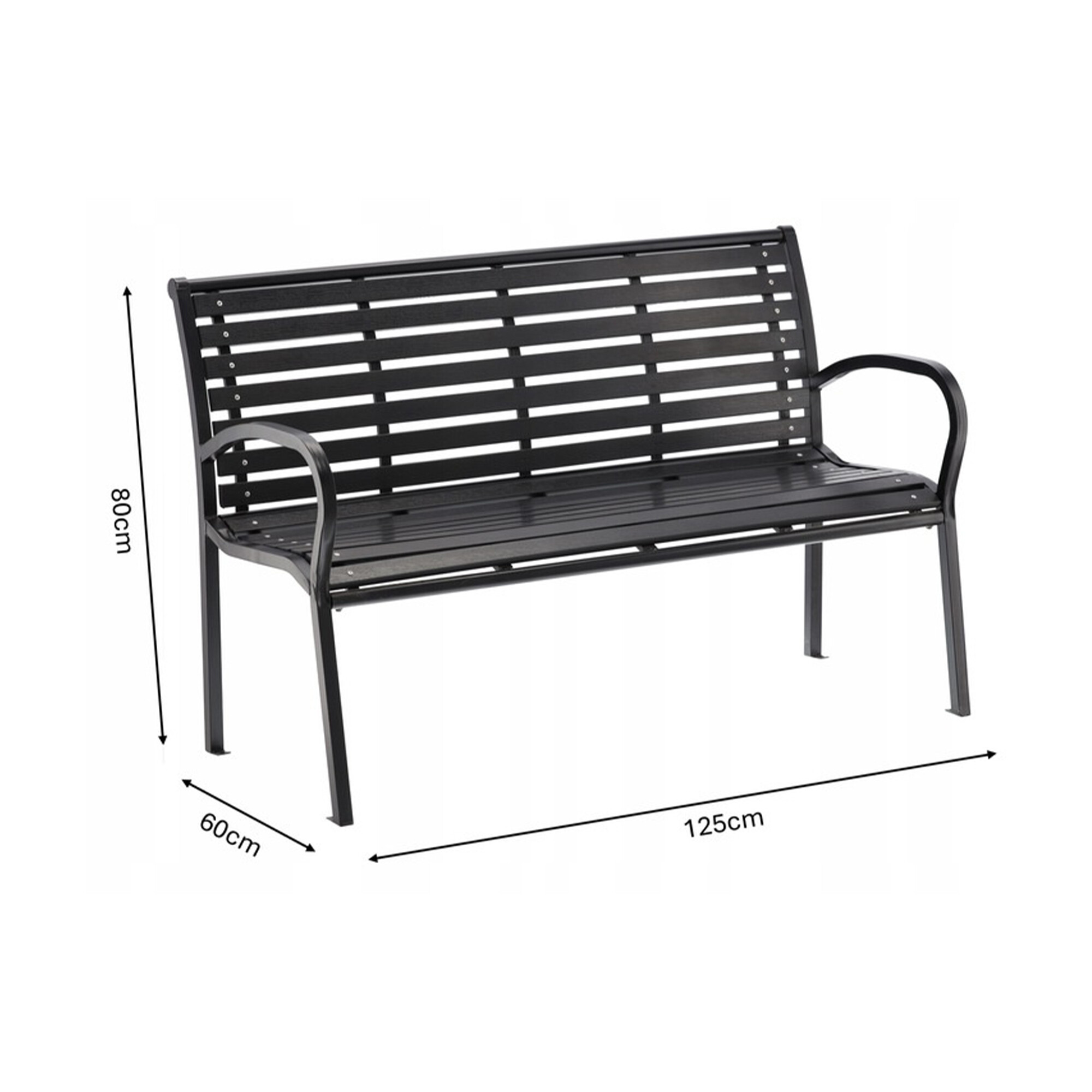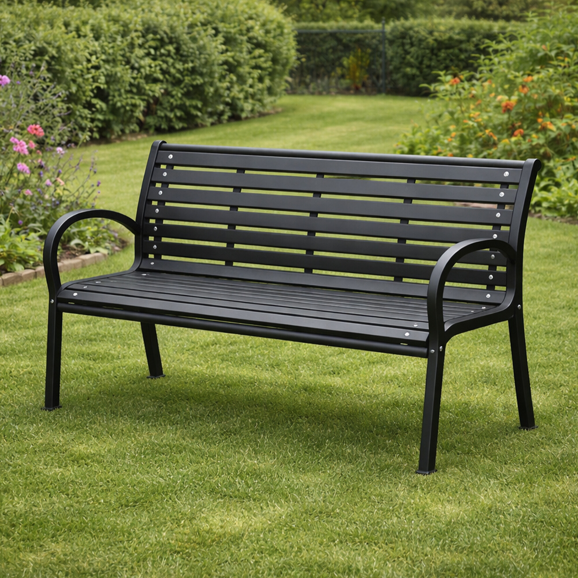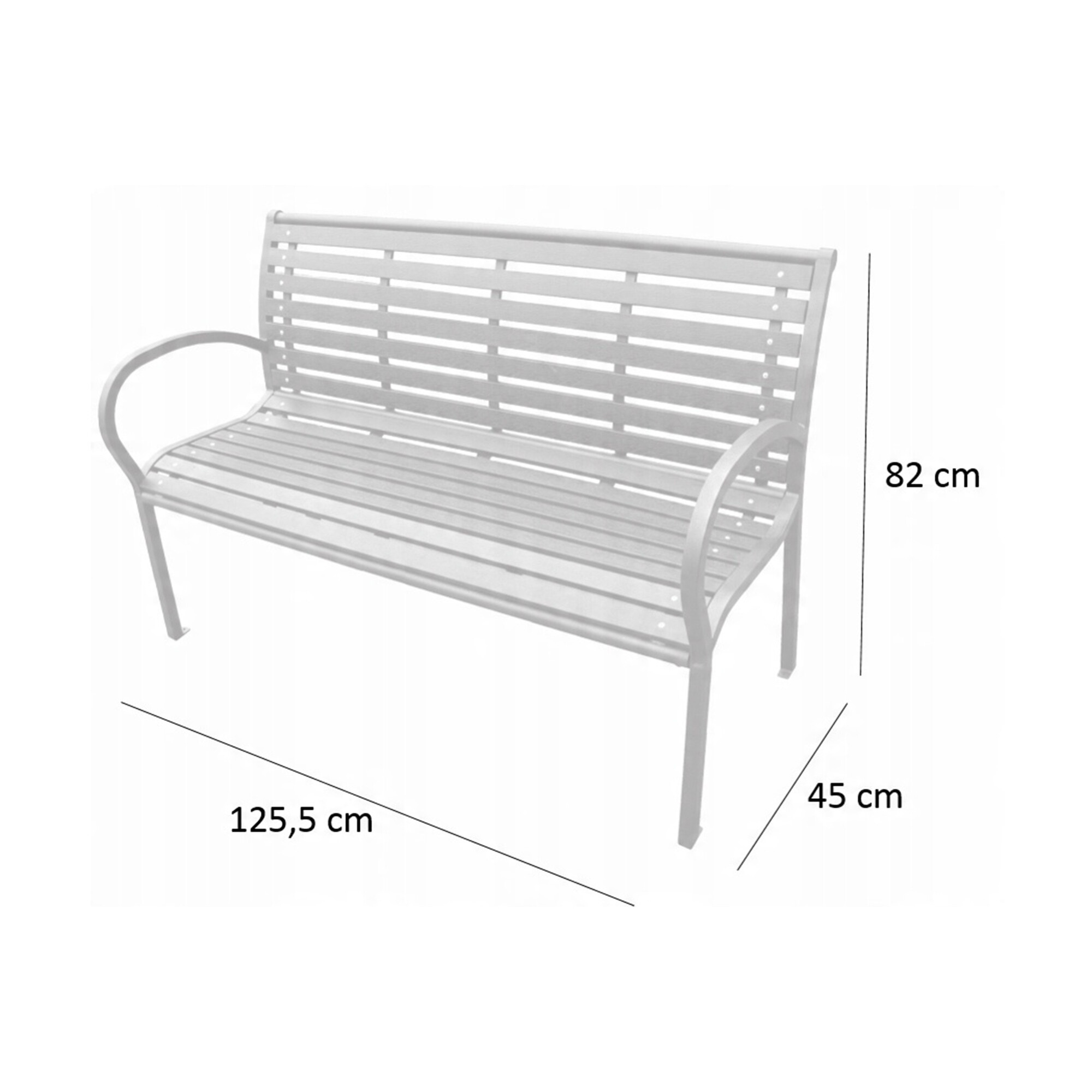 Pevná ocelová konstrukce, která je doplněna o plastové latě imitující dřevo. Nosnost lavice 150 kg.