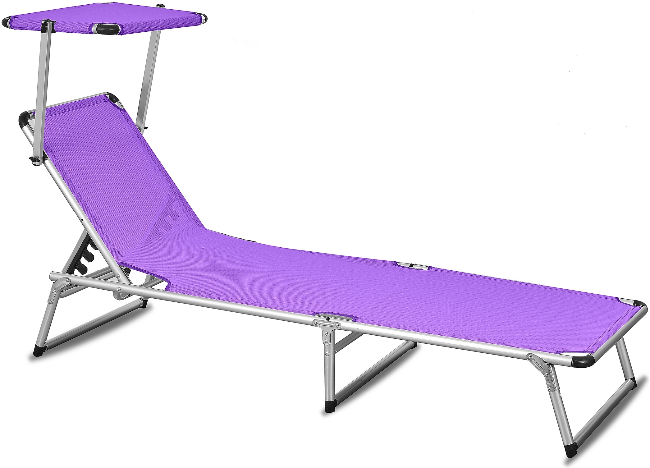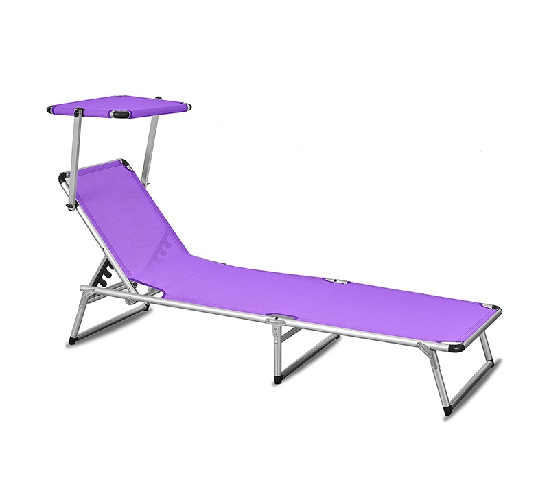 Skládací zahradní lehátko se stříškou a zpevněnou hliníkovou konstrukcí, v moderním designu, vhodné pro zahrady, na kempování či pláže.