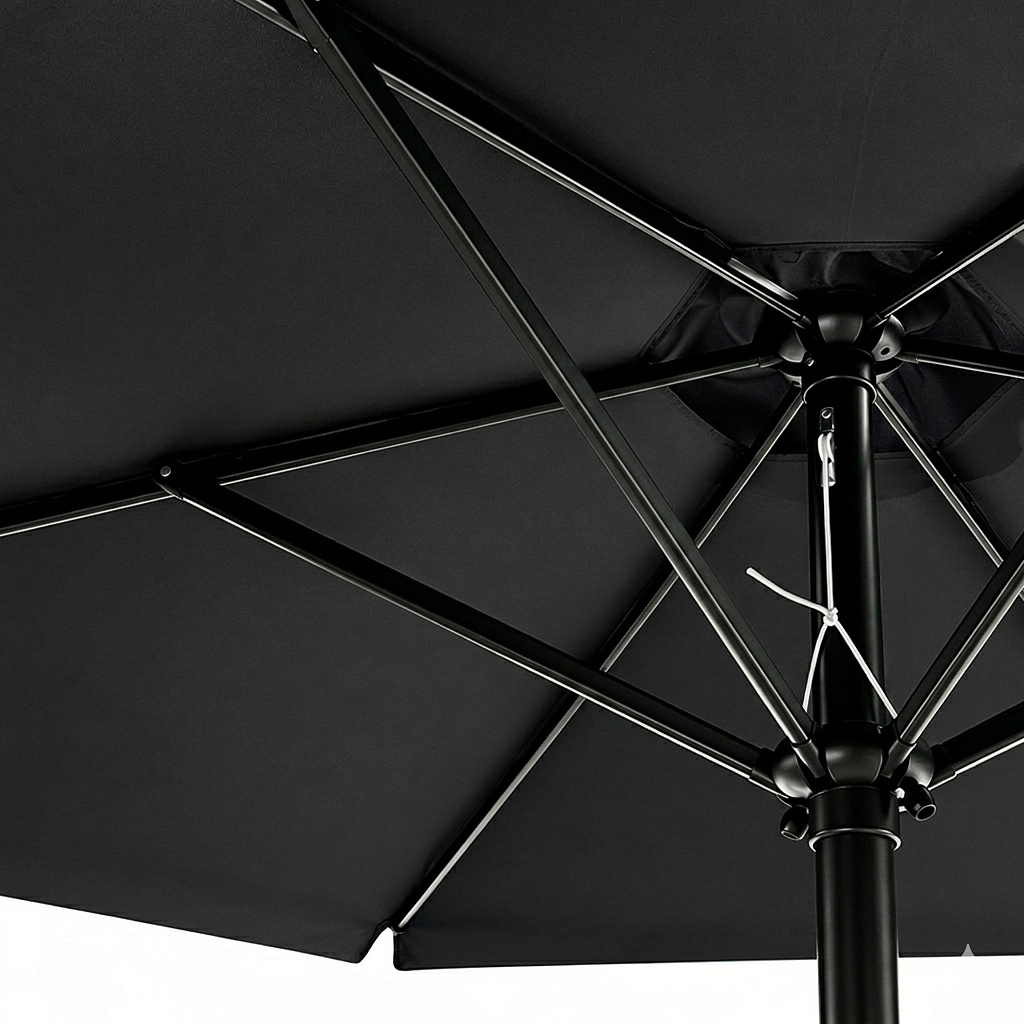 Konstrukce slunečníku je vyrobena z kvalitního hliníku, který vyniká svou pevností a zároveň nízkou hmotností. Oproti klasické oceli je hliníkový slunečník odolnější vůči korozi, což z něj činí ideální řešení pro dlouhodobé venkovní použití. Stabilitu celé konstrukce zajišťuje robustní středová tyč o průměru 48 mm spolu s pevnými žebry, díky nimž slunečník drží tvar a odolává běžným povětrnostním podmínkám.