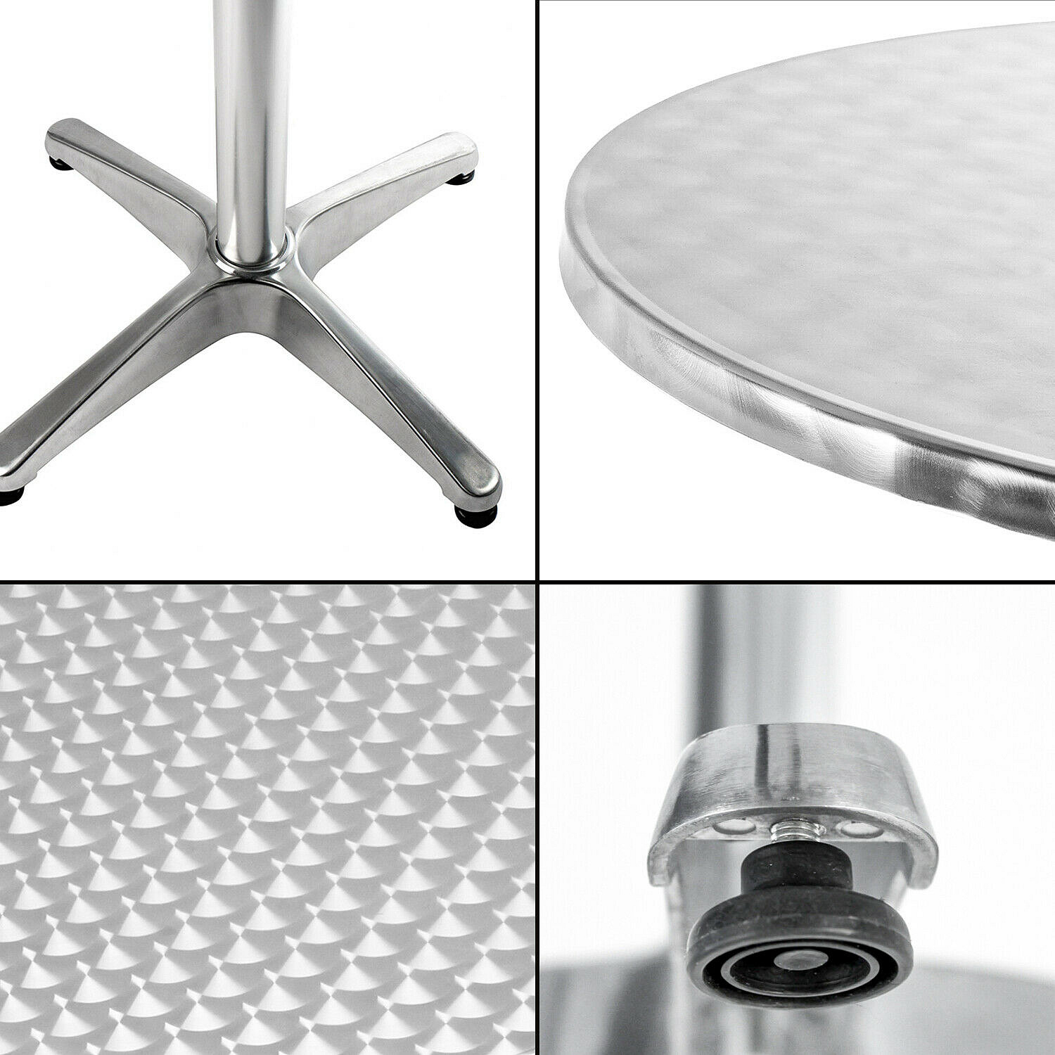 Zahradní stůl BISTRO s pevným hliníkovým rámem a nerezovou deskou v moderním designu, vhodný pro zahrady, terasy, kavárny, altánky, balkóny či pláže.