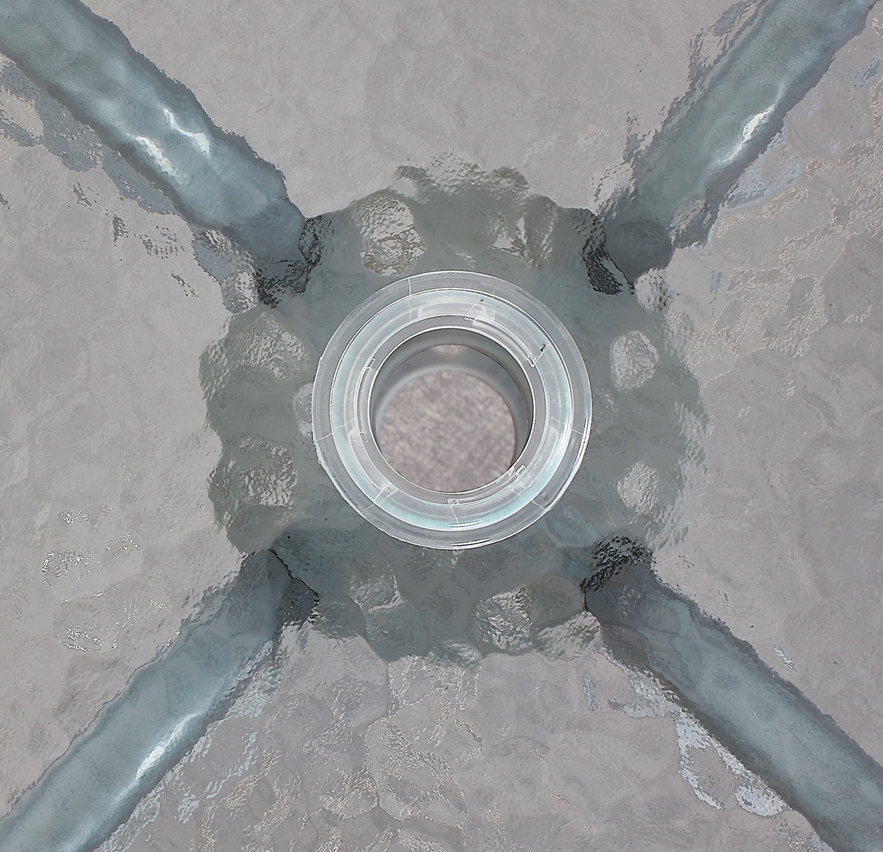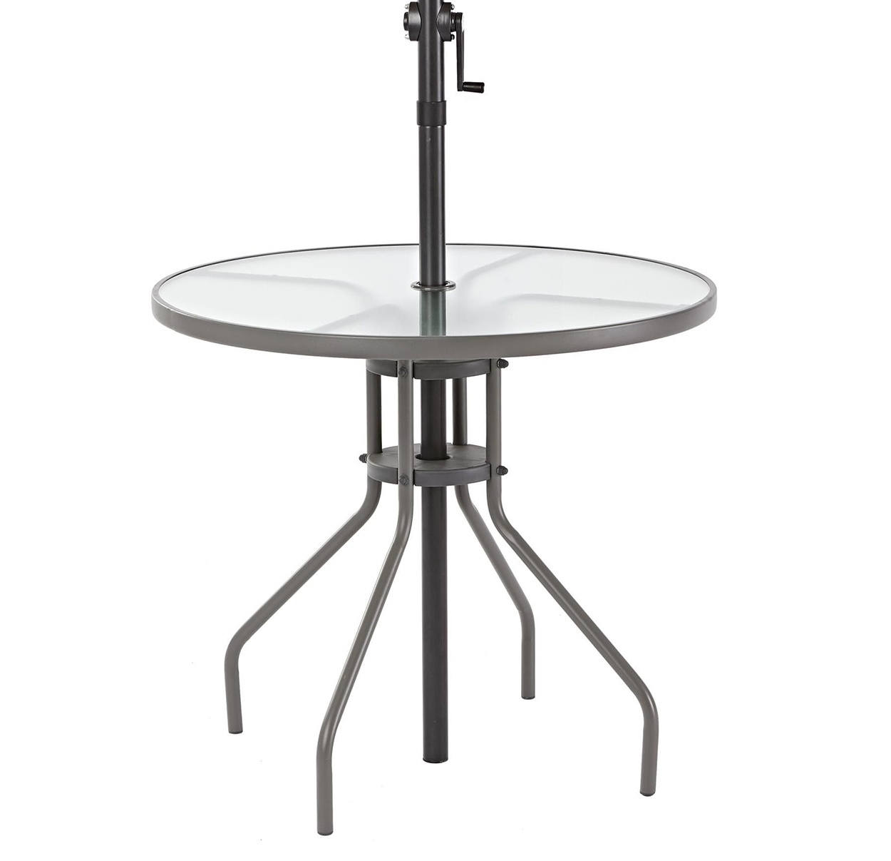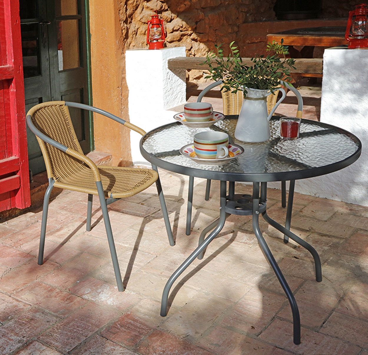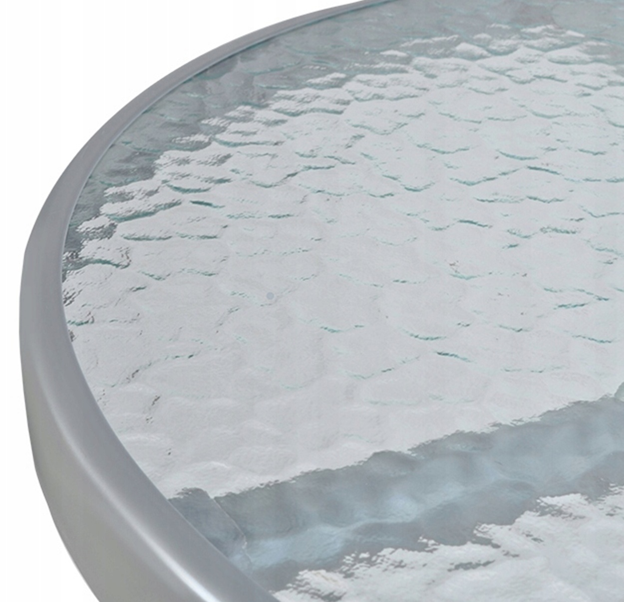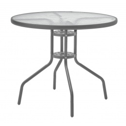 Kulatý zahradní stůl s pevným kovovým rámem a texturovanou skleněnou deskou, vhodný pro zahrady, terasy, kavárny, altánky, balkóny.