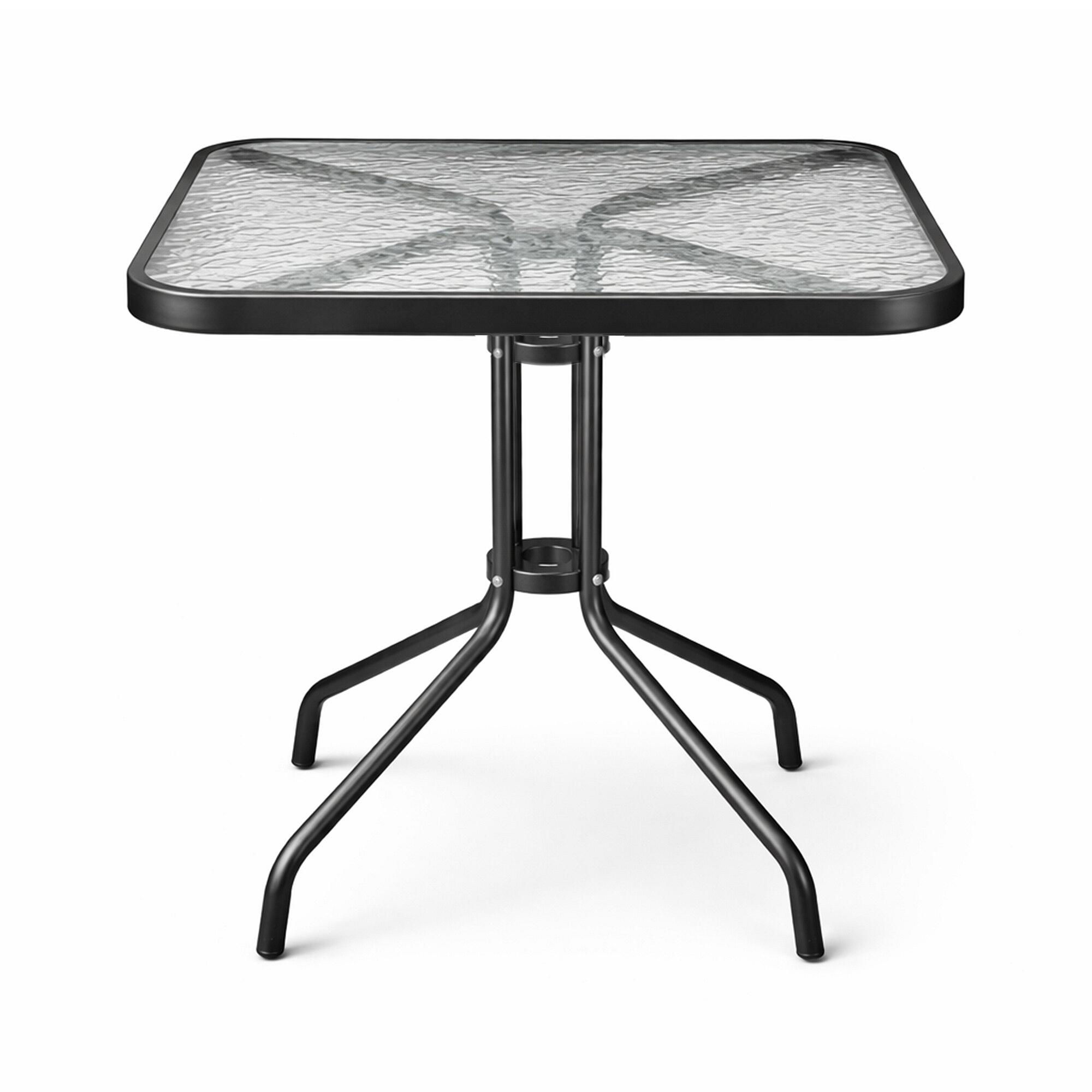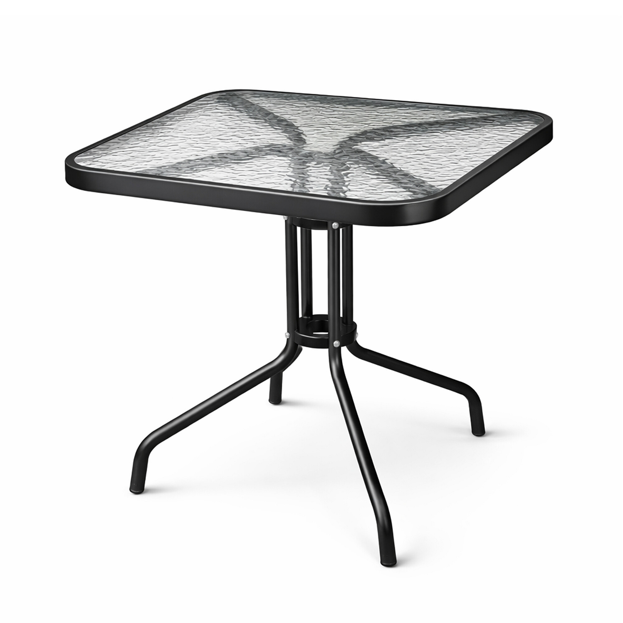 Zahradní stůl s pevným kovovým rámem a skleněnou deskou, vhodný pro zahrady, terasy, kavárny, altánky, balkóny.