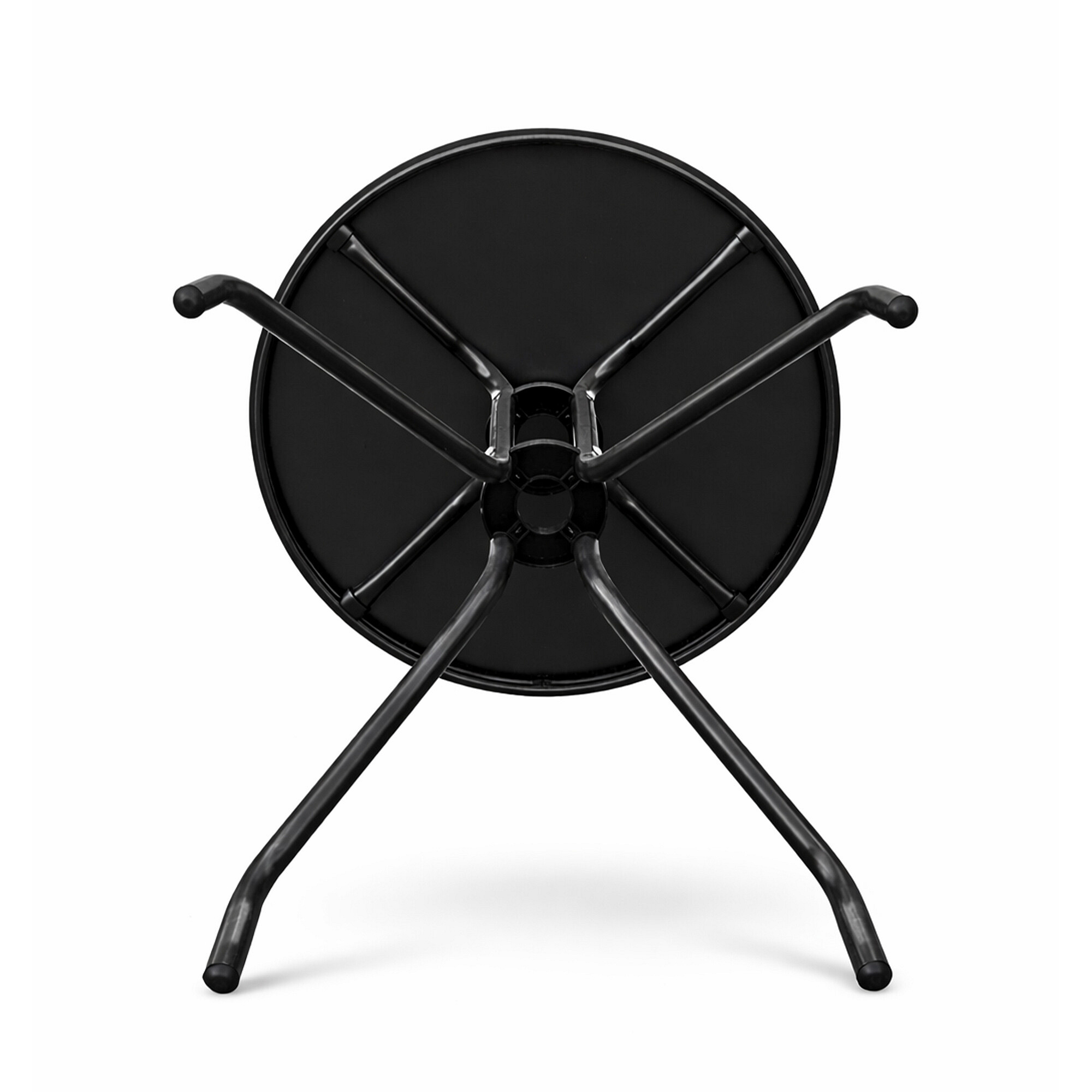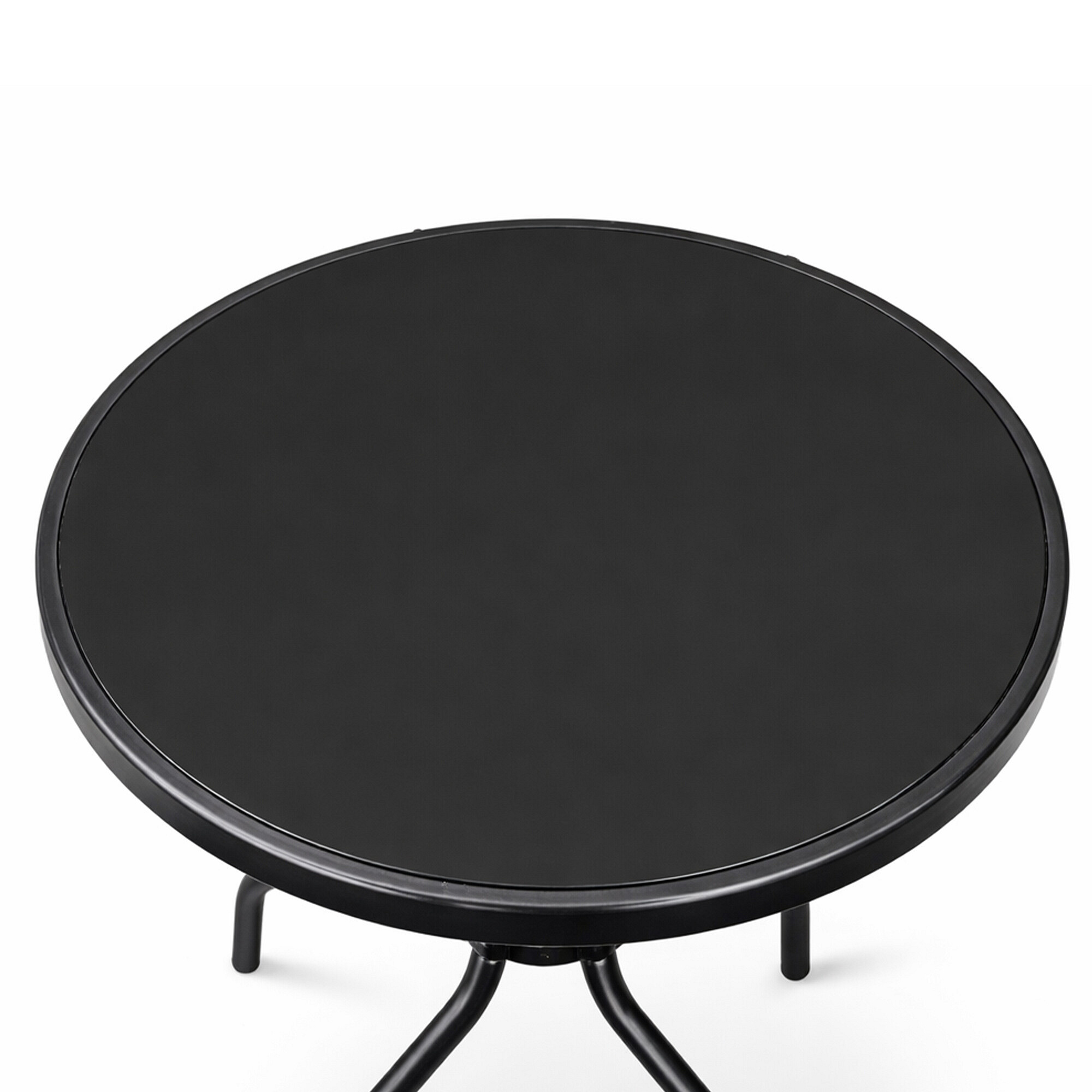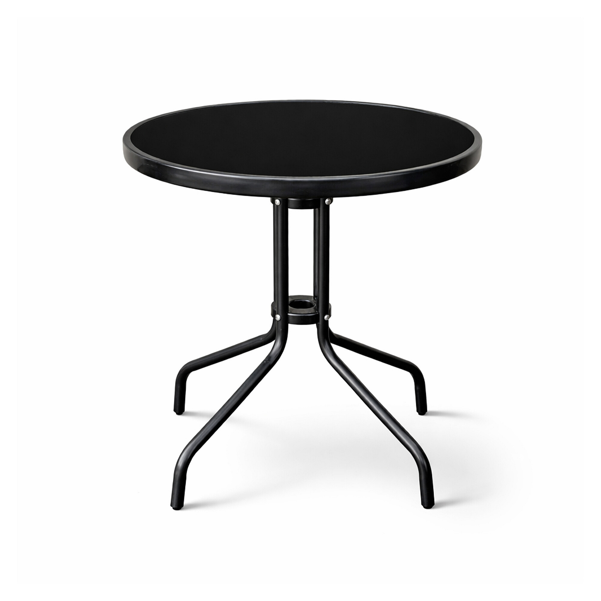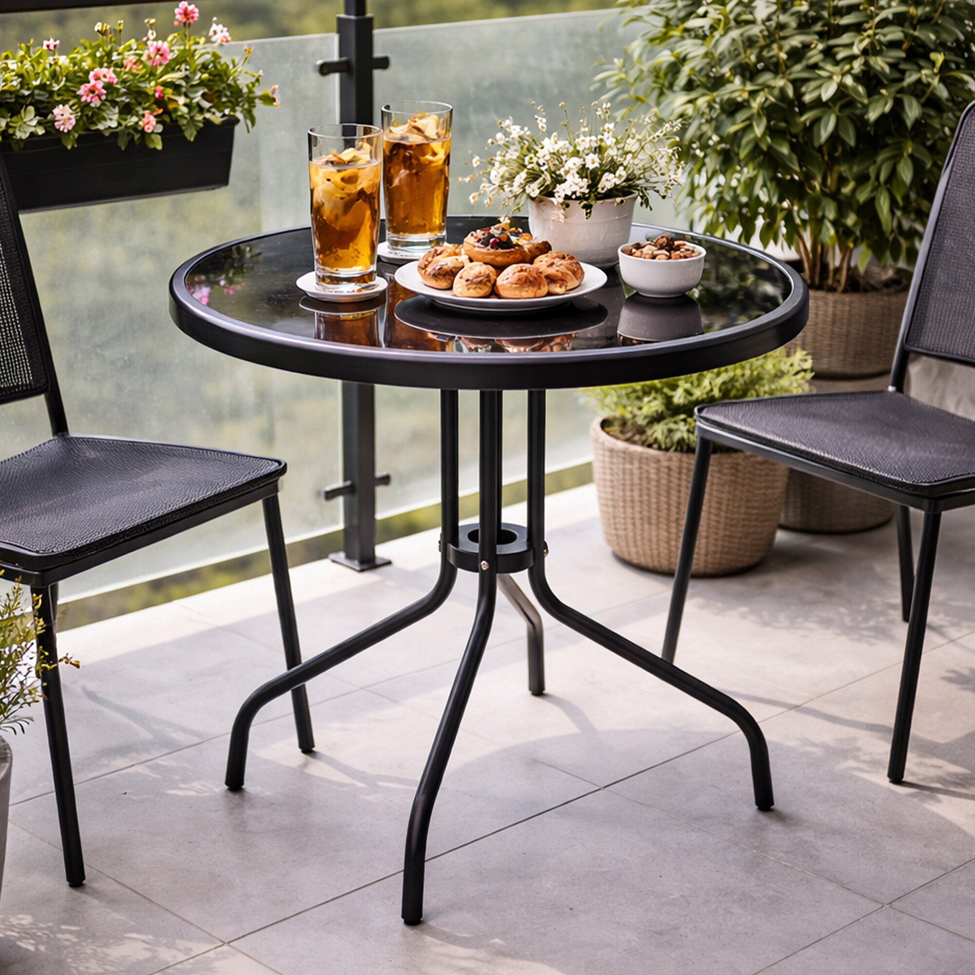 Kulatý zahradní stůl s pevným kovovým rámem a skleněnou deskou, vhodný pro zahrady, terasy, kavárny, altánky, balkóny.