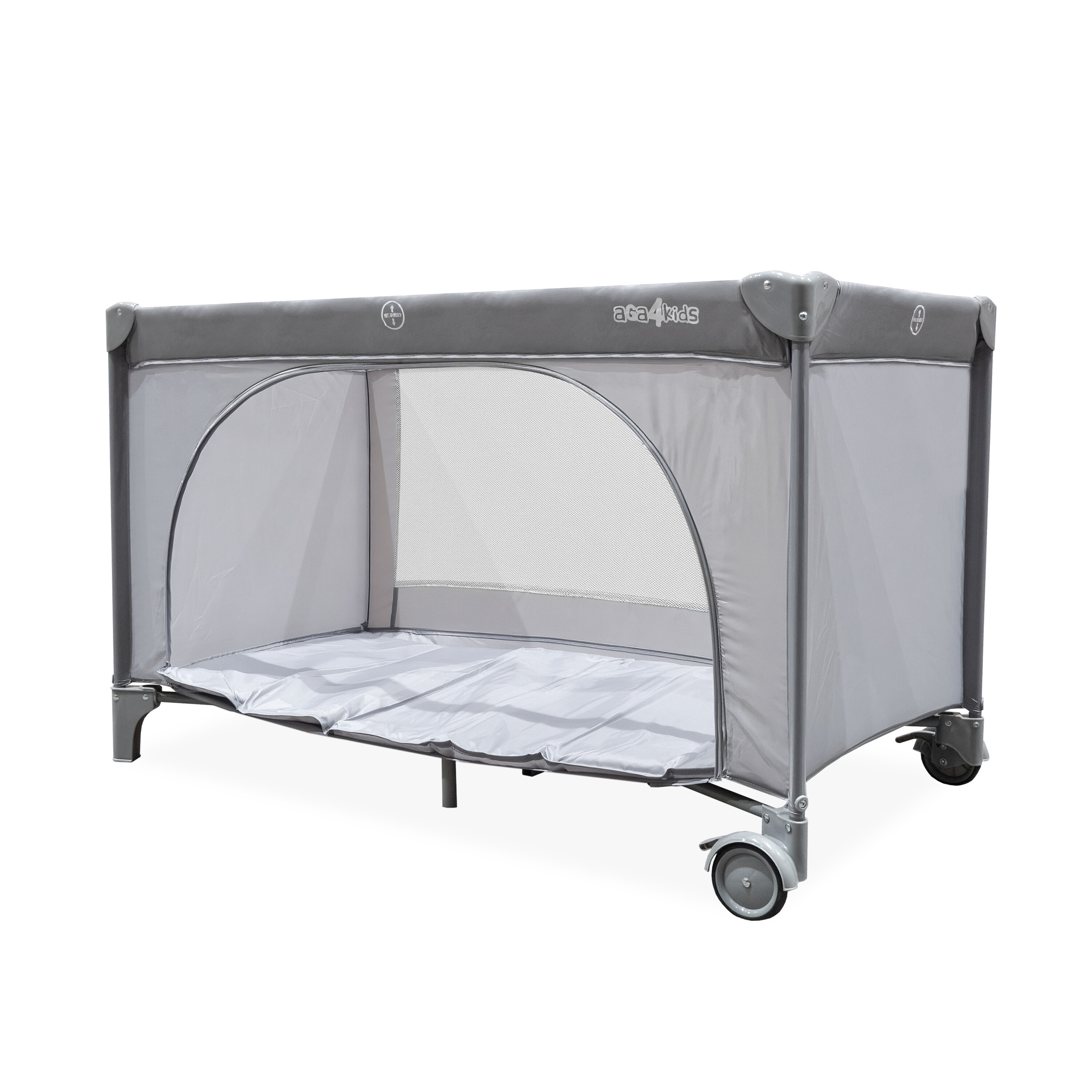 Je vybavena dvěmi praktickými kolečky s brzdami pro snadnější manipulaci. Pro starší děti je na postýlce umístěn vchod, kterým si samy vylezou ven.