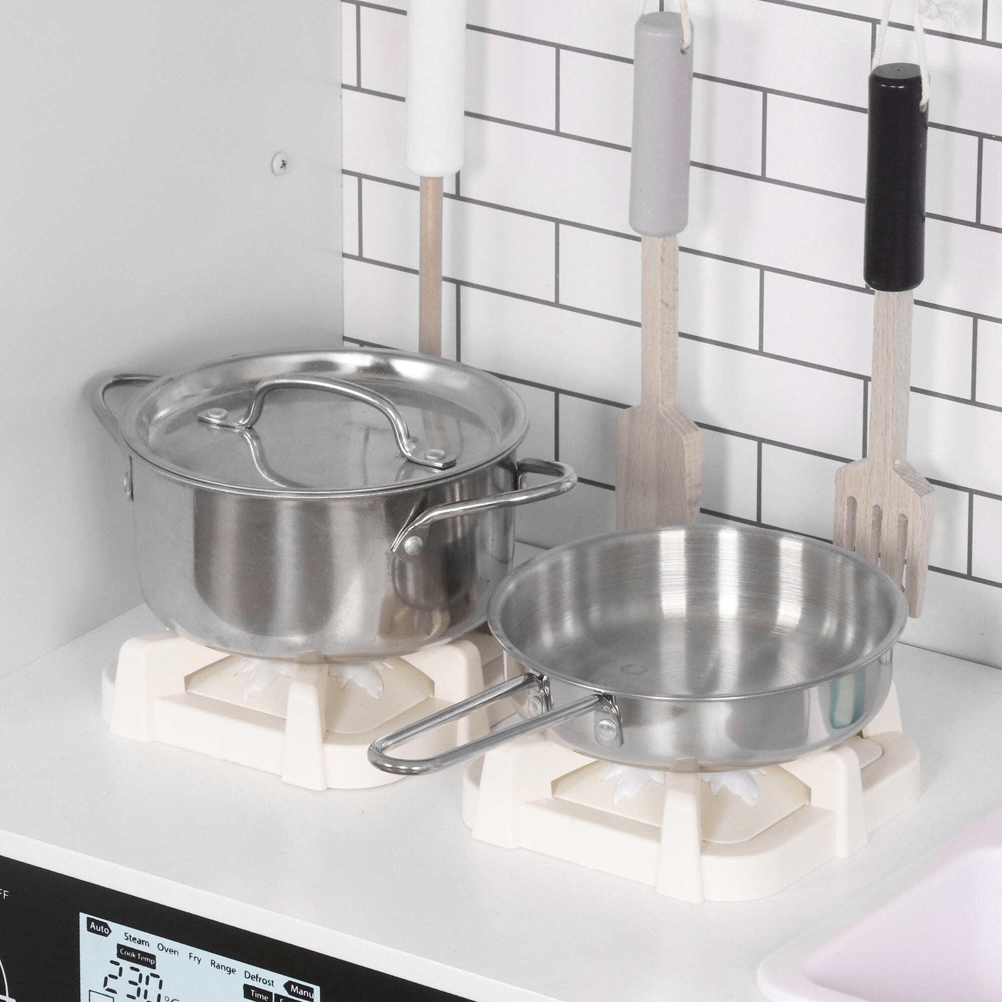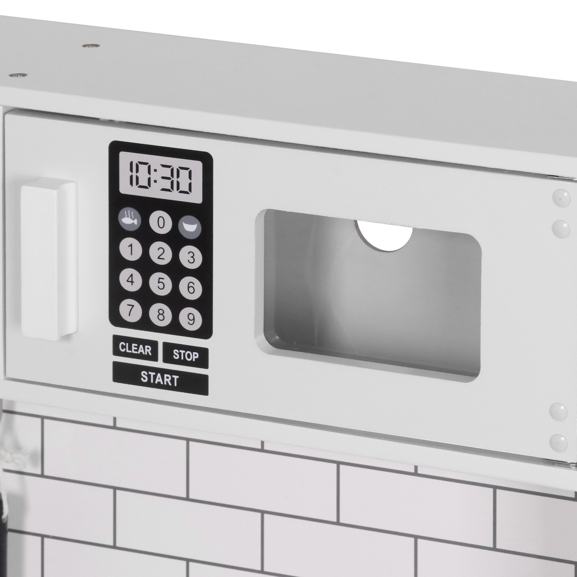 Kuchyňka je vybavena všemi důležitými spotřebiči, které děti znají z domácnosti pečicí troubou, mikrovlnnou troubou, sporákem s plotýnkami, digestoří a dřezem. V horní části se nachází tradiční digestoř spojená s mikrovlnnou troubou, která díky světelným a zvukovým efektům působí velmi realisticky. Ovládací knoflíky na troubě vydávají typické cvakavé zvuky, takže děti mají pocit skutečného pečení a nastavování teploty. Součástí kuchyňky je také nádobí, poličky určené pro jeho uložení a háčky na zavěšení kuchyňského náčiní.