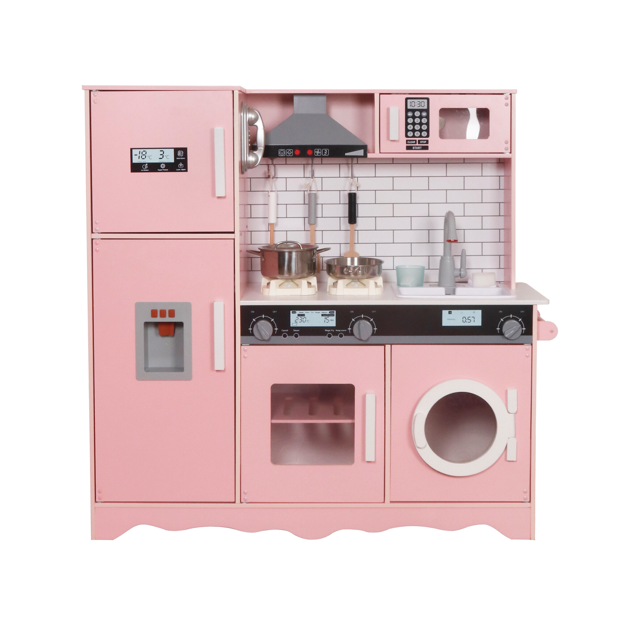V horní části dětské kuchyně je tradiční digestoř kombinovaná s mikrovlnnou troubou. Digestoř má také světelné a zvukové efekty.