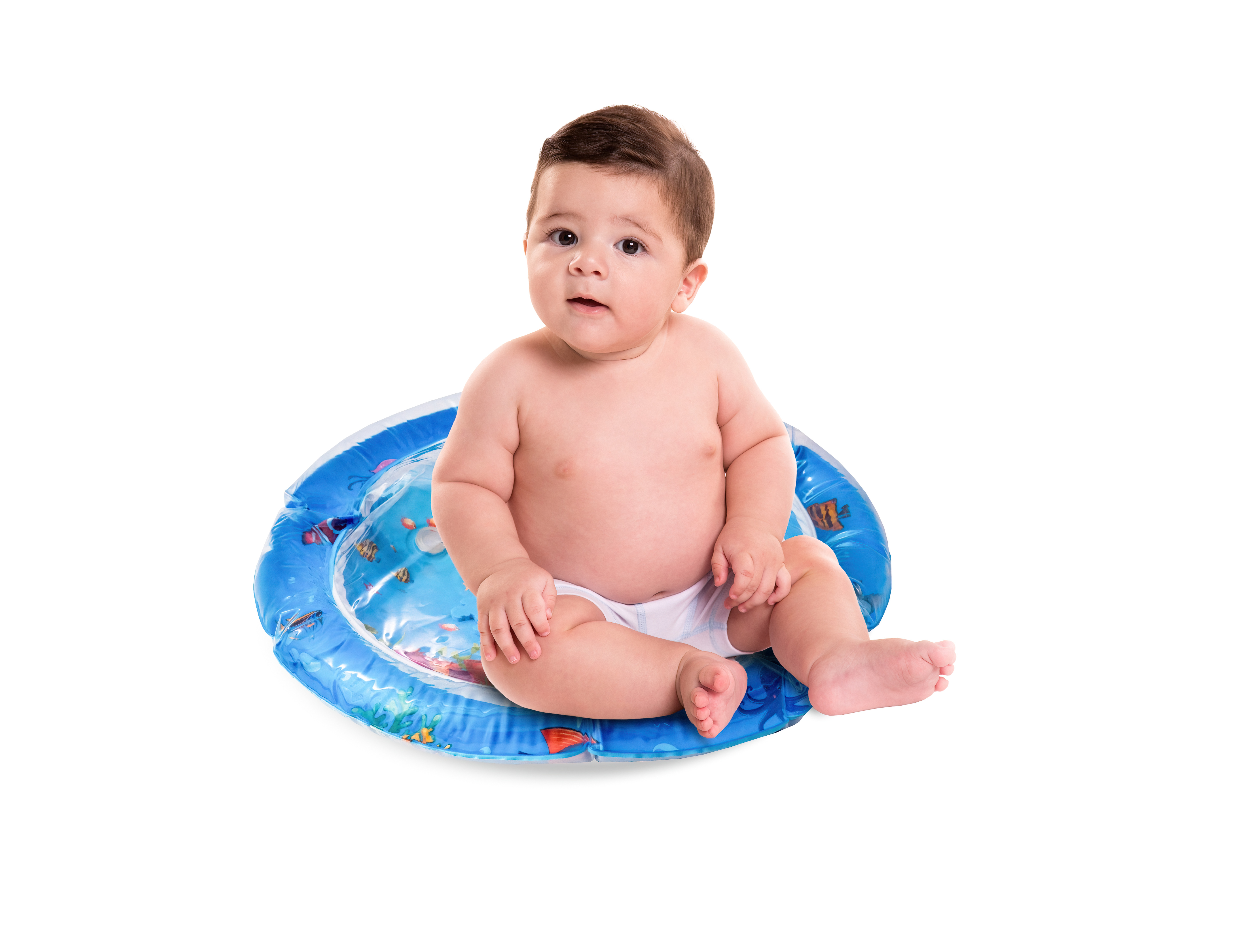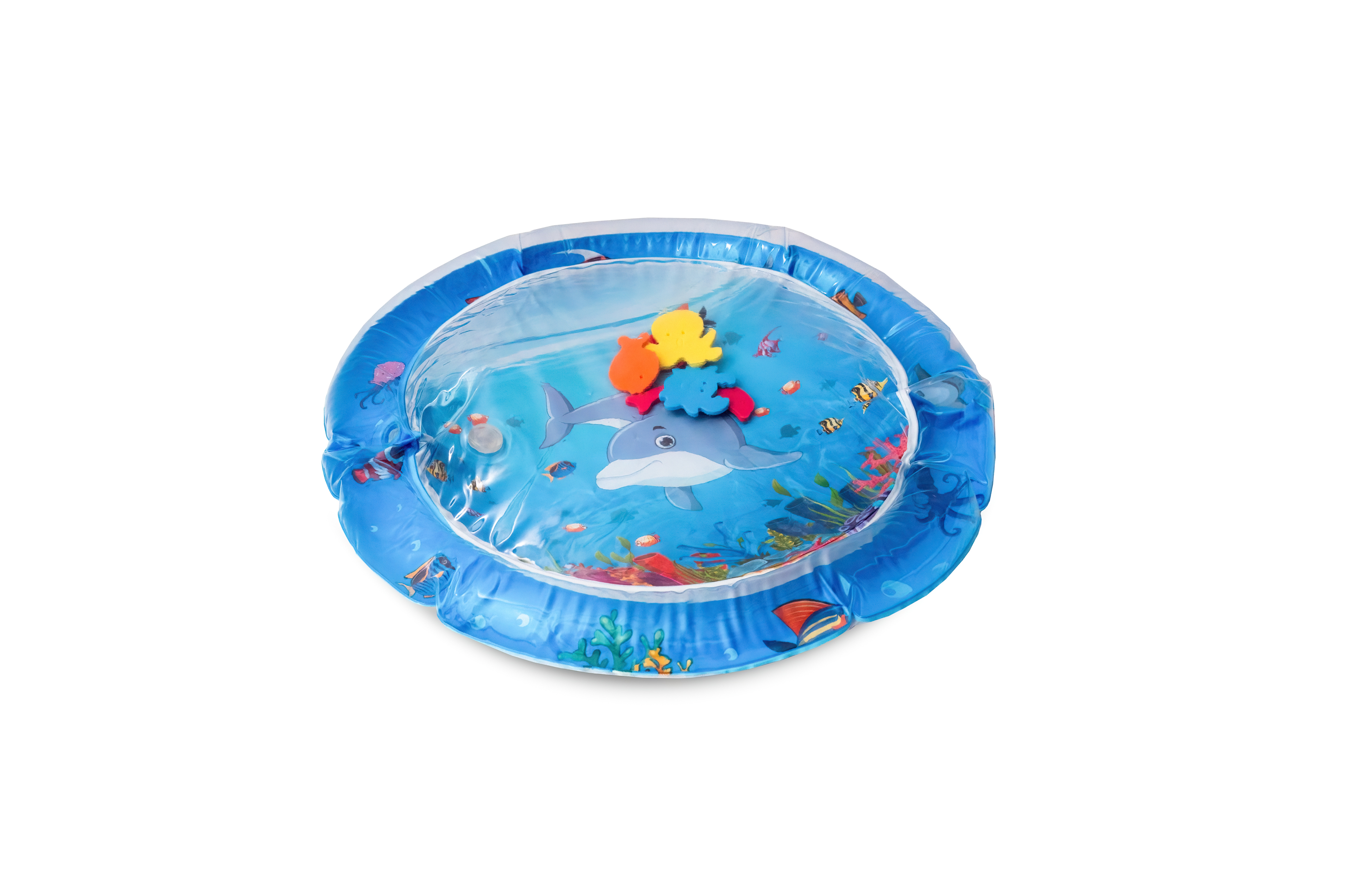 Stačí nafoukat okraj podložky a střed naplnit vodou popřípadě je možnost ji nafouknout. Díky vodě uvnitř se začnou pohybovat prvky ve tvaru mořských živočichů, které dítě povzbuzují ke hře.
