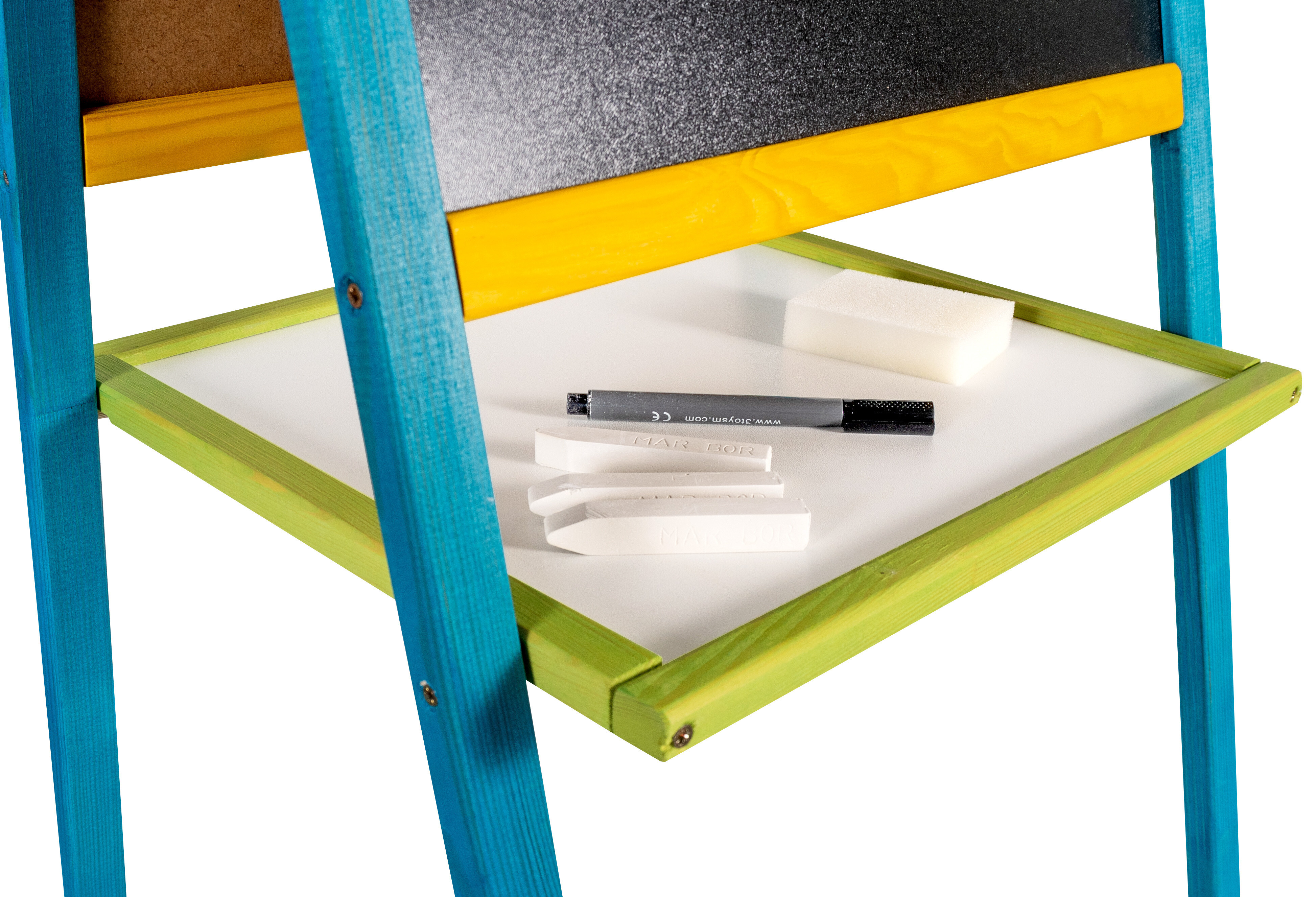- Černá strana tabule slouží pro kreslení křídami a bílá magnetická pro kreslení fixy