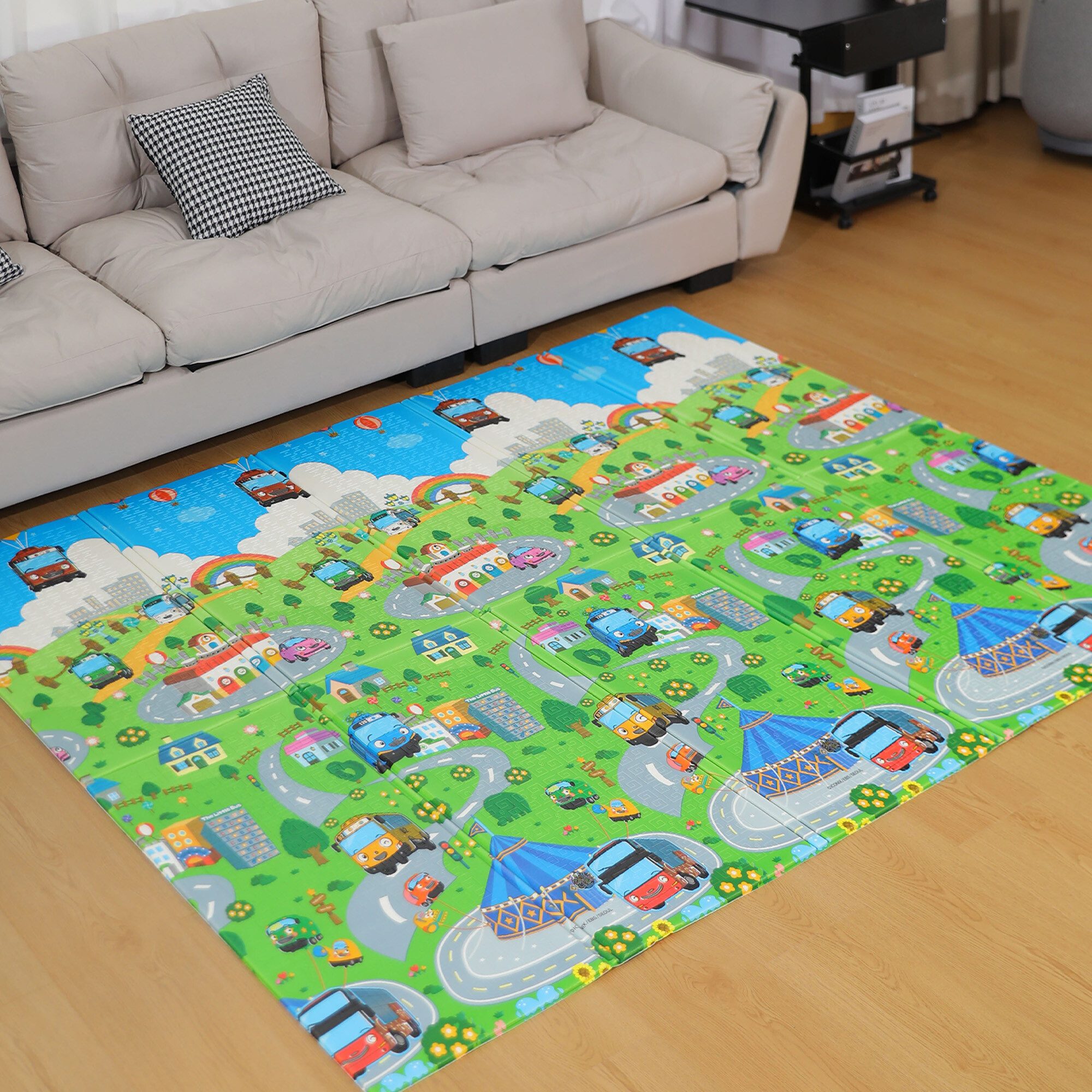 Hrací podložka má oboustranný potisk s veselými motivy a protiskluzový povrch zajistí bezpečnost každé hry.