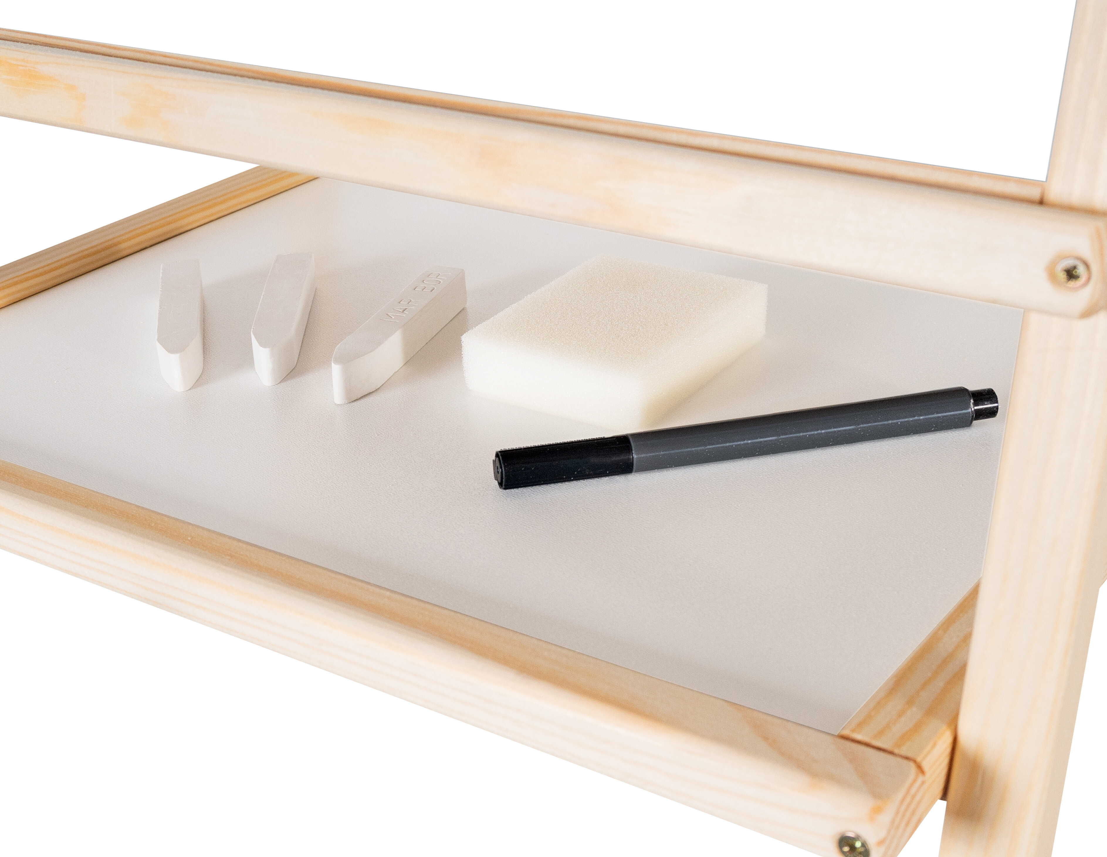 - Sada obsahuje - 2 dětské tabule, 3 křídy, 1 fix, 1 role papíru (20 m), 1 houbu
