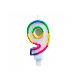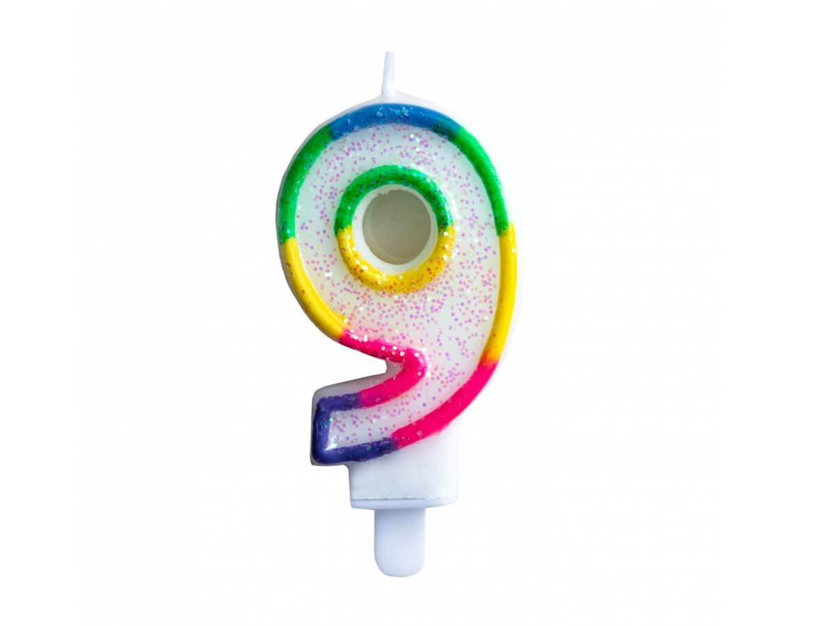 Třpytivá svíčka číslo "9" s duhovým okrajem je dokonalá dekorace dortu.