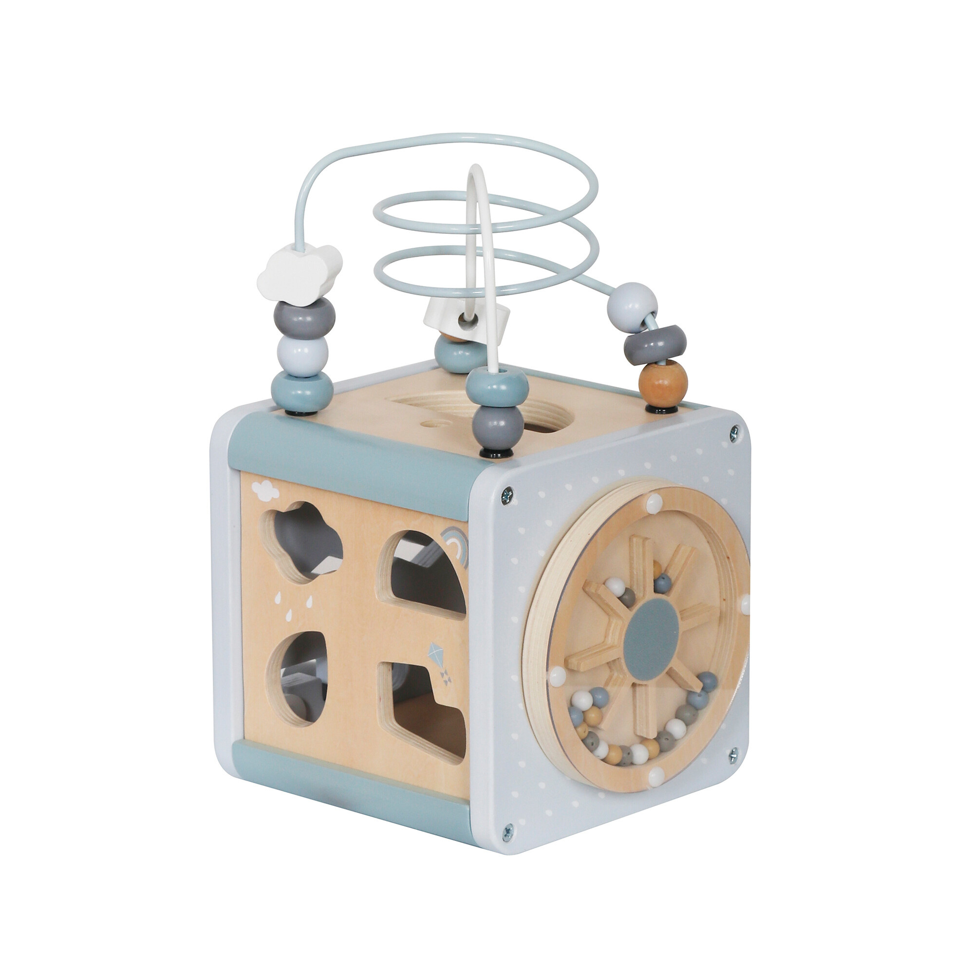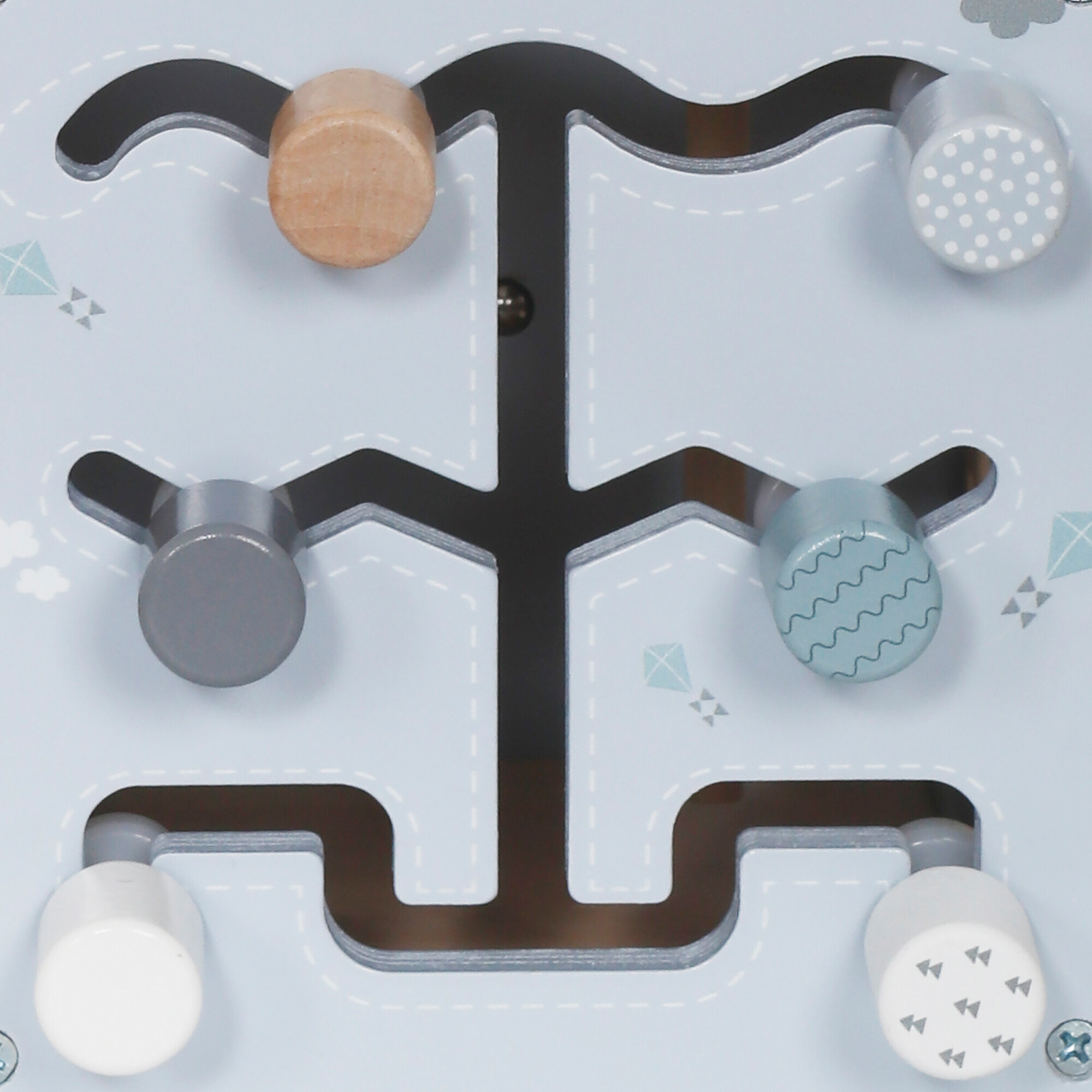 Na vrchní straně kostky je umístěn motorický labyrint. Posouváním korálků z jedné strany na druhou si dítě procvičí jemnou motoriku a cit v rukách.