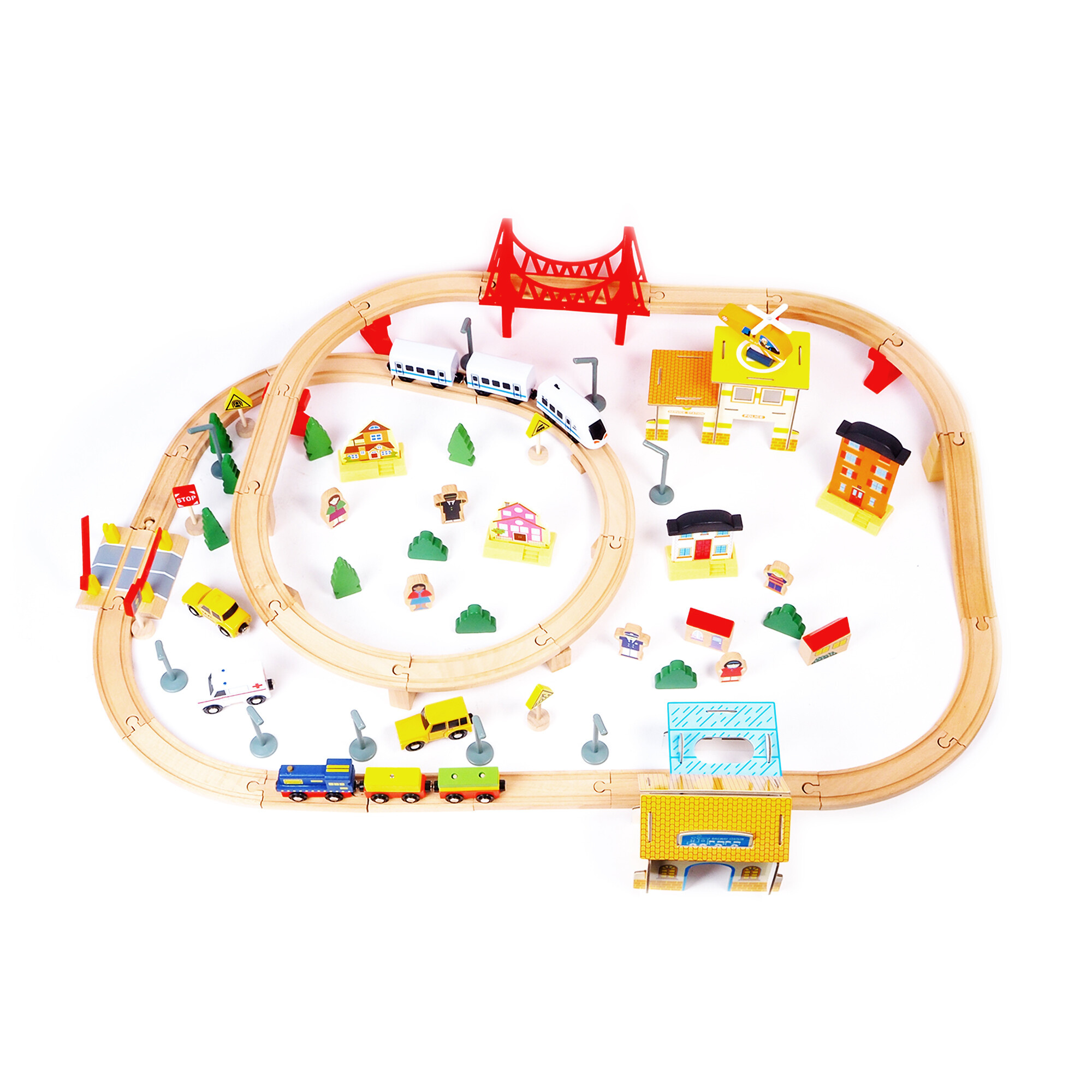 - Sada obsahuje - části kolejnic s mostem, vlaky, lokomotiva, vagóny, přejezd, zastávka, auta, budovy, figurky, dopravní značky, vrtulník a stromy