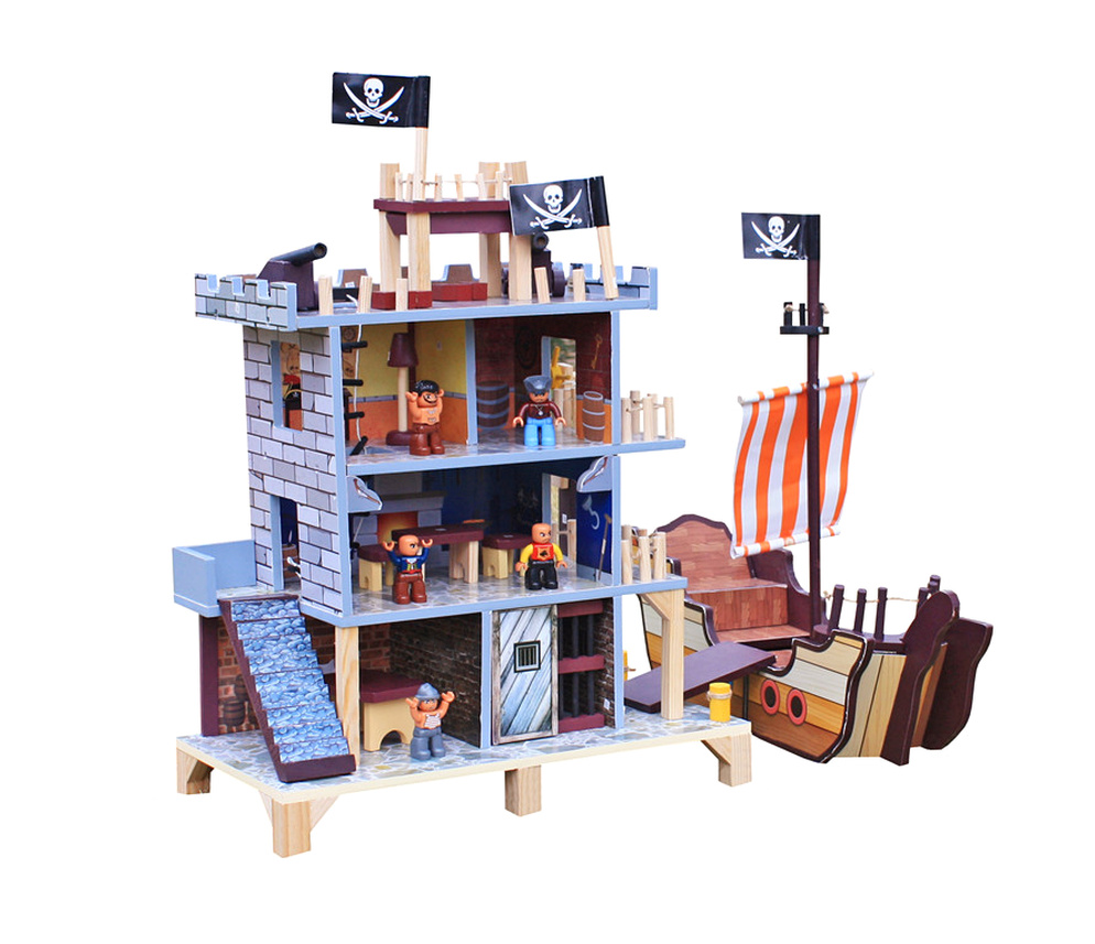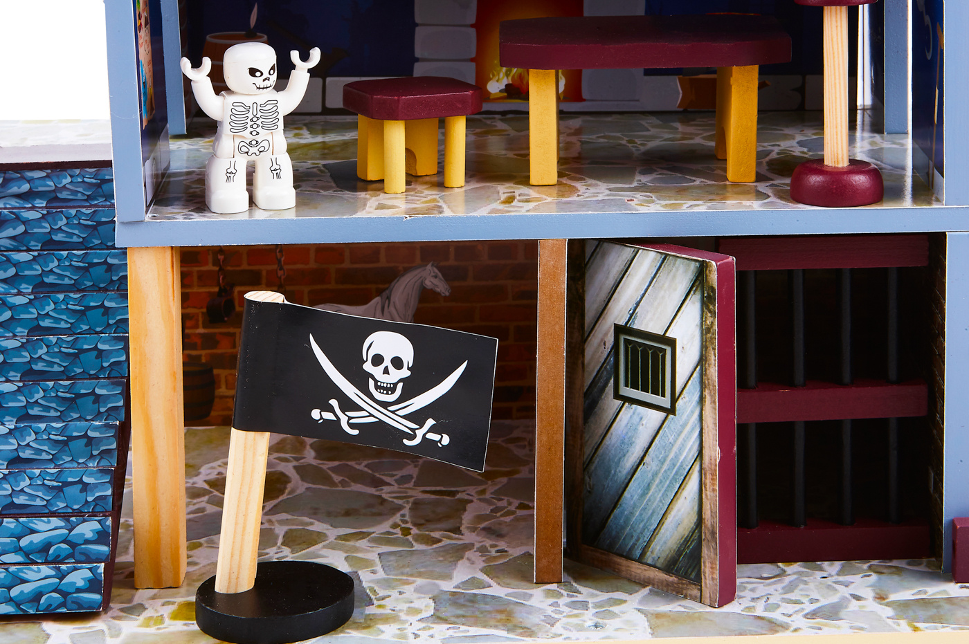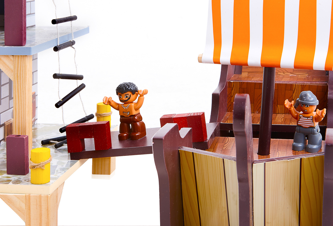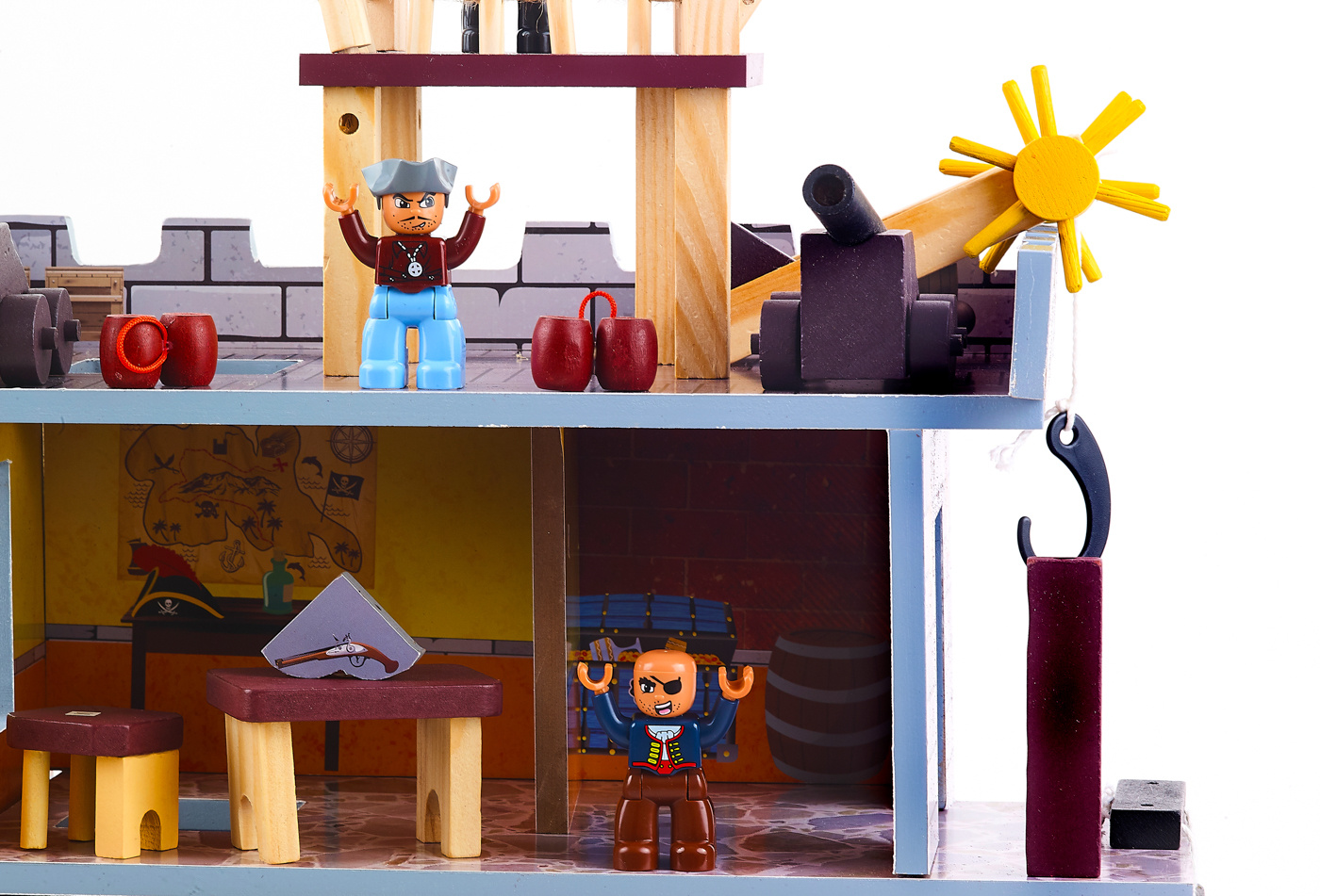 - Nechybí vězeňská cela, strážná věž s vlajkou a dvěma děly a přístav pro pirátský koráb