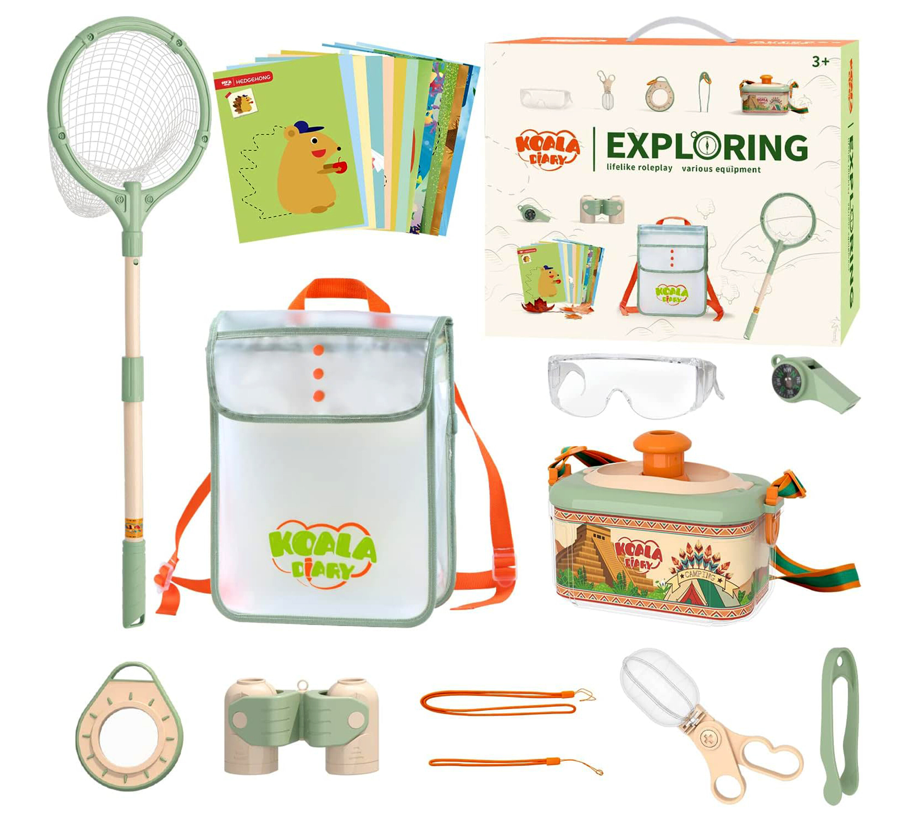 Set obsahuje síťku na hmyz, která pomůže zachytit hmyz pro pozorování. Multifunkční píšťalku, která může současně sloužit jako kompas. Dalekohled s nastavitelným úhlem pohledu, lupu a mnoho dalších užitečných nástrojů pro prozkoumávání přírody.