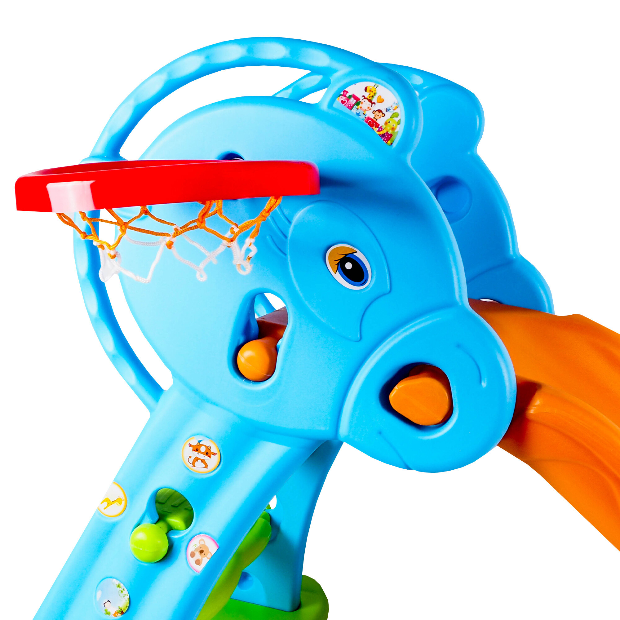 Je vybavena také basketbalovým košem a míčkem, což dětem poskytuje další možnosti zábavy a pohybu. Děti si mohou hrát na malého basketbalistu a trénovat své dovednosti při házení míčem do koše.