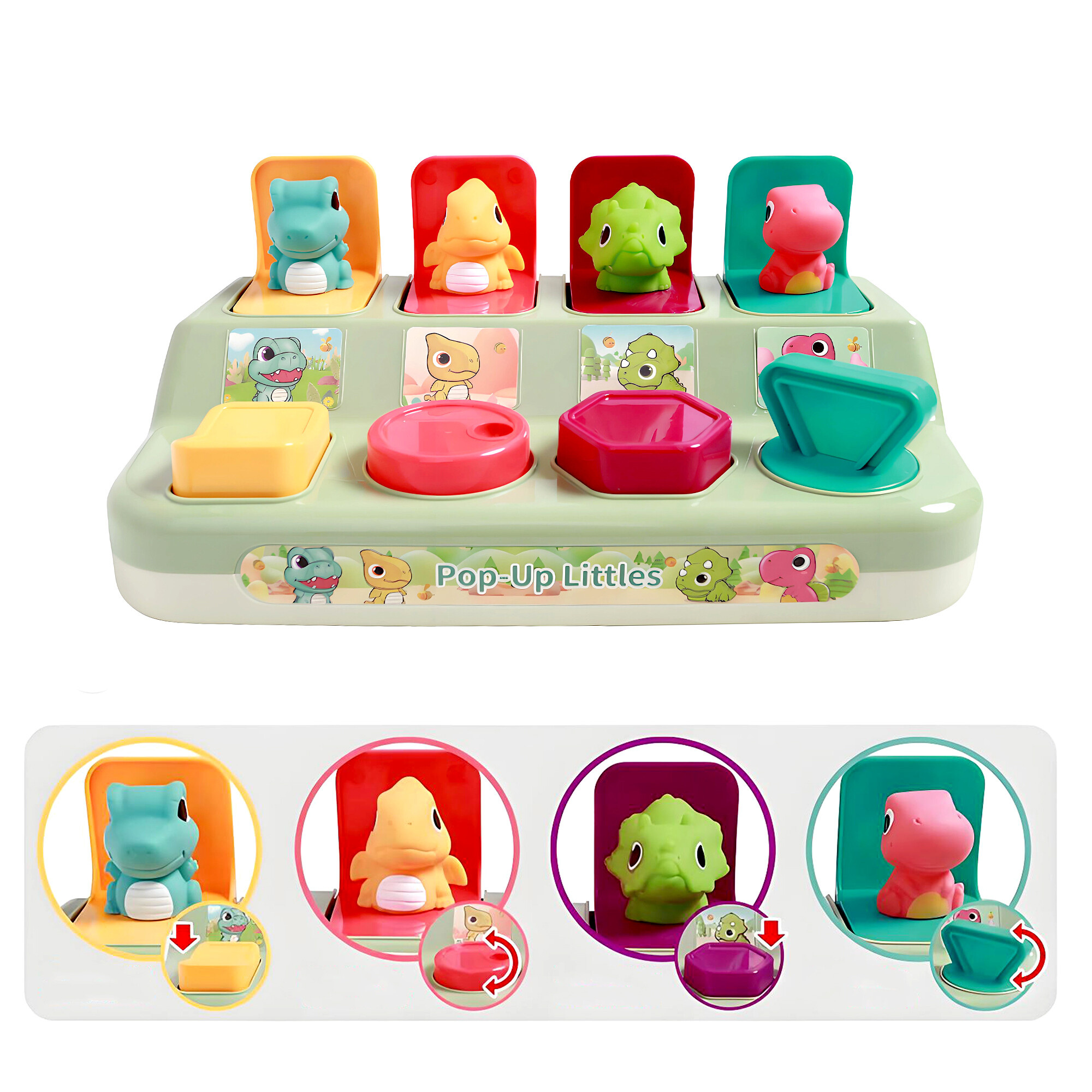 Hračka má čtyři roztomilé figurky dinosaurů, které se schovají uvnitř a čekají, až jim batole pomůže dostat se ven. Když dítě stiskne, přepne nebo otočí některý z interaktivních prvků, jedno ze zvířat vyskočí.