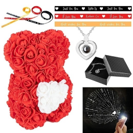 Sada pro milovanou osobu - medvídek vyrobený z růžových květů a hologramový náhrdelník zobrazující výraz "miluji tě" až ve 100 jazycích! Náhrdelník byl zabalen do elegantní krabičky. K sadě jsou přiloženy 3 stuhy vhodné pro každou příležitost. Aby zobrazit projekci, stačí posvítit baterkou na čočku náhrdelníku. . Specifikace: medvídek z květů růží o rozměrech: 18x18x23 cm růže vyrobené z plastu náhrdelník - hologram zobrazující výraz "miluji tě" ve 100 jazycích taška na zabalení dárku a převázání stuhou 3 stuhy o délce. 100 cm - vhodné pro každou příležitost Počet ks. na paletě: 240