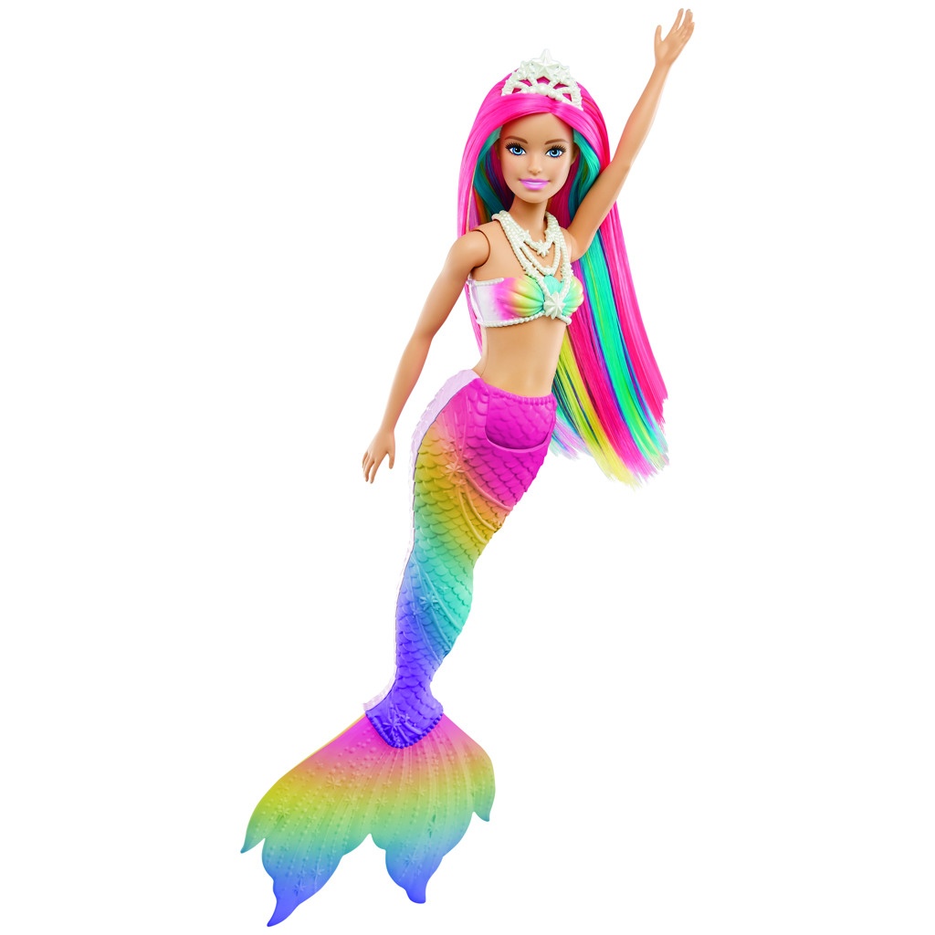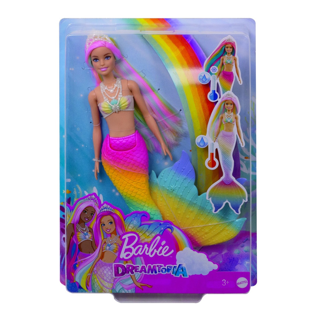 Tato panenka Barbie ™ Dreamtopia Rainbow Magic ™ Mořská panna se vyznačuje barevnými proměnami, díky nimž se představivost může ponořit do svých dosud nejbarvitějších pohádek! Panenka Barbie® mořská panna má neonově zářivý fantazijní vzhled s čelenkou ve svých duhových vlasech, zářivým vícebarevným ocasem a živůtkem s prvky inspirovanými mořem. Jste připraveni na transformaci barev? Ponořte panenku Barbie® do teplé vody a sledujte, jak její vlasy, živůtek a ocas okamžitě mění barvu a odhalují duhu hezkých pastelových barev! Ponořte ji do ledově studené vody, abyste viděli její proměnu zpět do původního neonově jasného vzhledu a znovu a znovu prožívejte transformaci. Panenka nemůže plavat nebo zůstat sama. Barvy a dekorace se mohou lišit.