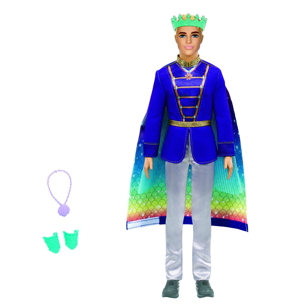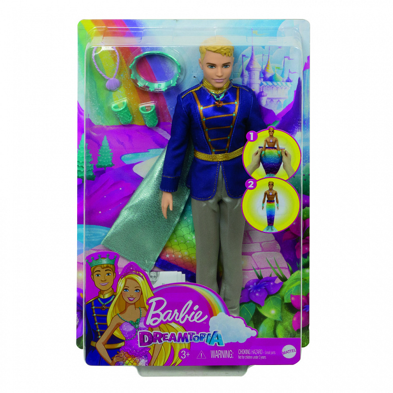 Tato panenka Barbie™ Dreamtopia Ken™se vyznačuje fantastickou módní transformací pro dvojnásobnou zábavu při vyprávění příběhů! S královskou pláštěnkou, která se promění v jiskřivý rybí ocas mořského muže, se panenka Ken™ může během několika sekund proměnit z prince na člena podmořské královské rodiny. Jednoduše mu sundejte jeho královský oblek a pláštěnku, otočte pláštěnku naruby, aby se odkryl duhový rybí ocas mořského muže se třpytivými detaily, a připevněte ji zpět na místo, abyste změnili jeho vzhled! Panenka Ken™ je dodávána s korunkou, dvěma náramky a náhrdelníkem inspirovaným mořem pro dotvoření proměny prince na mořského muže. Milovníci pohádek ve věku od 3 let budou rádi znovu a znovu vytvářet vzhled panenky Ken™. Panenka nemůže plavat nebo zůstat sama. Barvy a dekorace se mohou lišit.