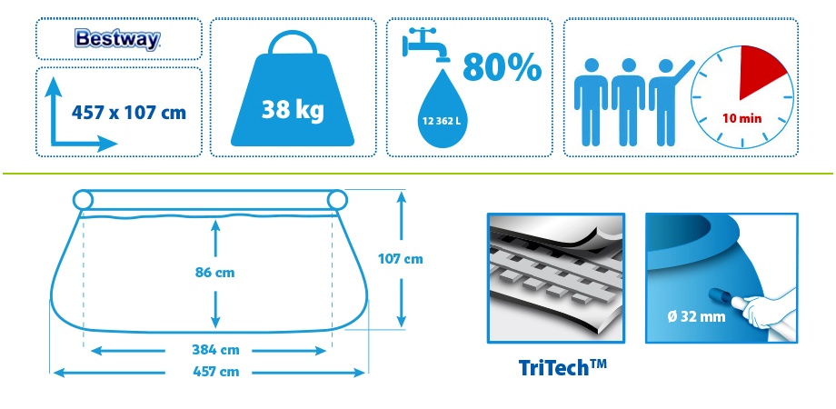 Specifikace bazénu Bestway Fast Set 4,57 x 1,07 m 57294 + Kartušová filtrace.