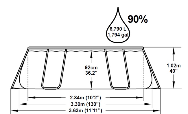 - Kapacita bazénu při 90% naplnění: 6 790 litrů